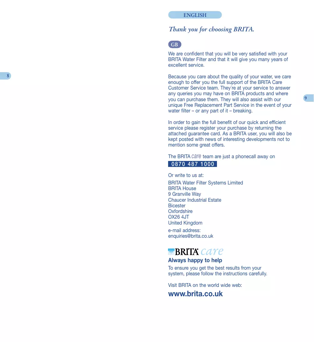 ENGLISH Thank you for choosing BRITA. We are confident that you will be very satisfied with your BRITA Water Filter and that it will give you many years of excellent service.
