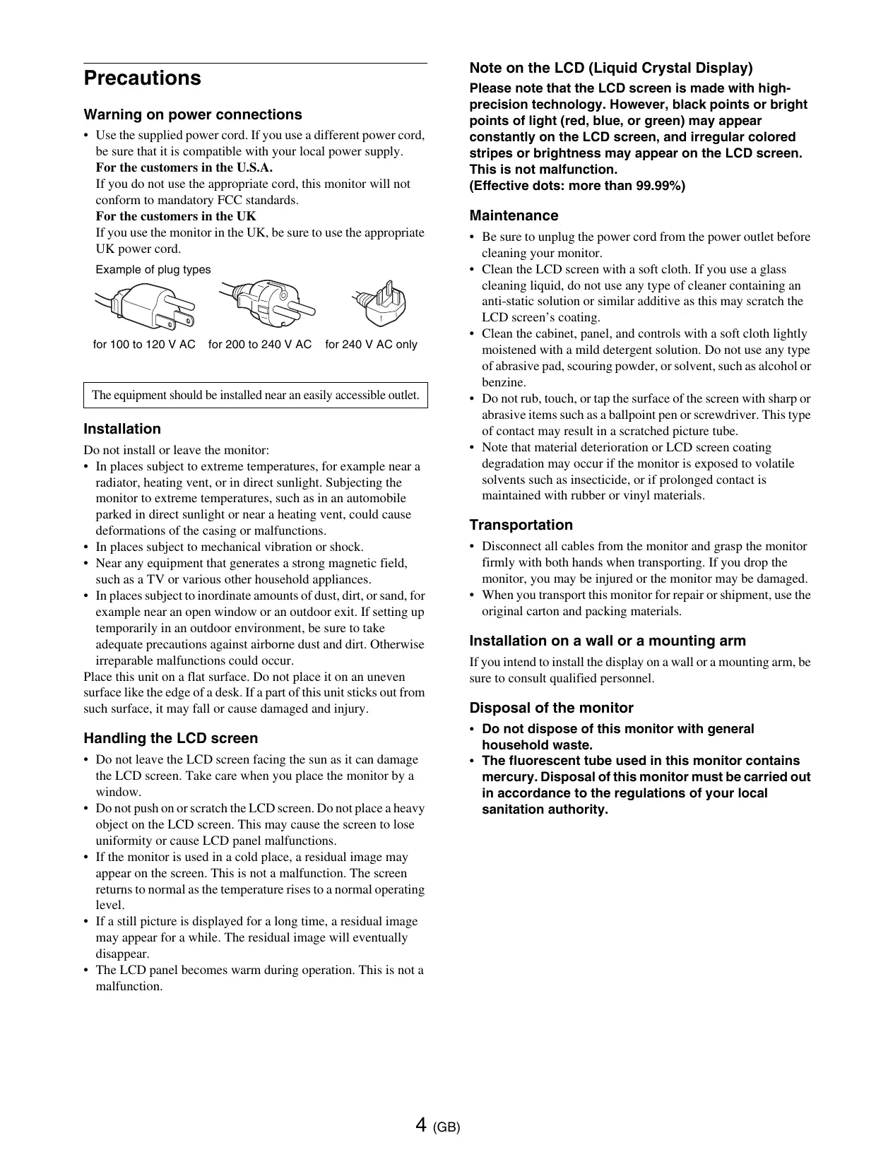 Réglage du rétroéclairage (RETROÉCLAIRAGE) . . . . . . . . . . . . . 10 Pour les clients aux Etats-Unis Si vous n’employez pas le câble approprié, ce moniteur ne sera pas conforme aux normes FCC obligatoires. Pour les clients au Royaume-Uni Si vous utilisez le moniteur au Royaume-Uni, veuillez utiliser le cordon d’alimentation adapté au Royaume-Uni. Exemples de types de fiches