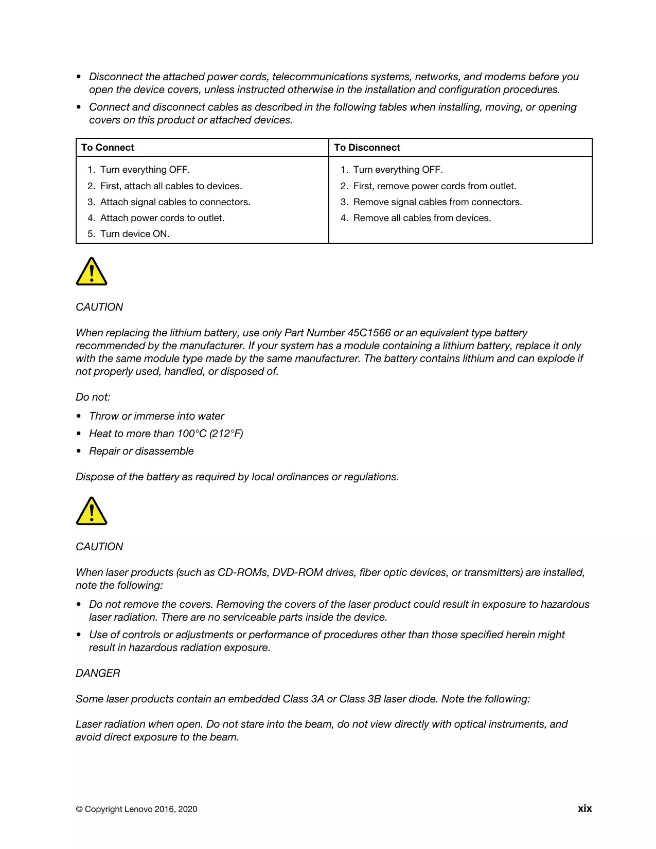 - Use of controls or adjustments or performance of procedures other than those specified herein might result in hazardous radiation exposure. DANGER Some laser products contain an embedded Class 3A or Class 3B laser diode. Note the following: Laser radiation when open. Do not stare into the beam, do not view directly with optical instruments, and avoid direct exposure to the beam. © Copyright Lenovo 2016, 2020 xix ≥18 kg (37 lb) ≥32 kg (70.5 lb) ≥55 kg (121.2 lb) CAUTION Use safe practices when lifting. CAUTION The power control button on the device and the power switch on the power supply do not turn off the electrical current supplied to the device. The device also might have more than one power cord. To remove all electrical current from the device, ensure that all power cords are disconnected from the power source.