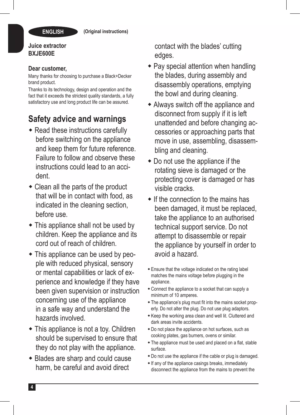 ENGLISH (Original instructions) Juice extractor BXJE600E Dear customer, Many thanks for choosing to purchase a Black+Decker brand product. Thanks to its technology, design and operation and the fact that it exceeds the strictest quality standards, a fully satisfactory use and long product life can be assured. Safety advice and warnings Read these instructions carefully before switching on the appliance and keep them for future reference. Failure to follow and observe these instructions could lead to an accident. Clean all the parts of the product that will be in contact with food, as indicated in the cleaning section, before use. This appliance shall not be used by children. Keep the appliance and its cord out of reach of children. This appliance can be used by people with reduced physical, sensory or mental capabilities or lack of experience and knowledge if they have been given supervision or instruction concerning use of the appliance in a safe way and understand the hazards involved. This appliance is not a toy. Children should be supervised to ensure that they do not play with the appliance. Blades are sharp and could cause harm, be careful and avoid direct