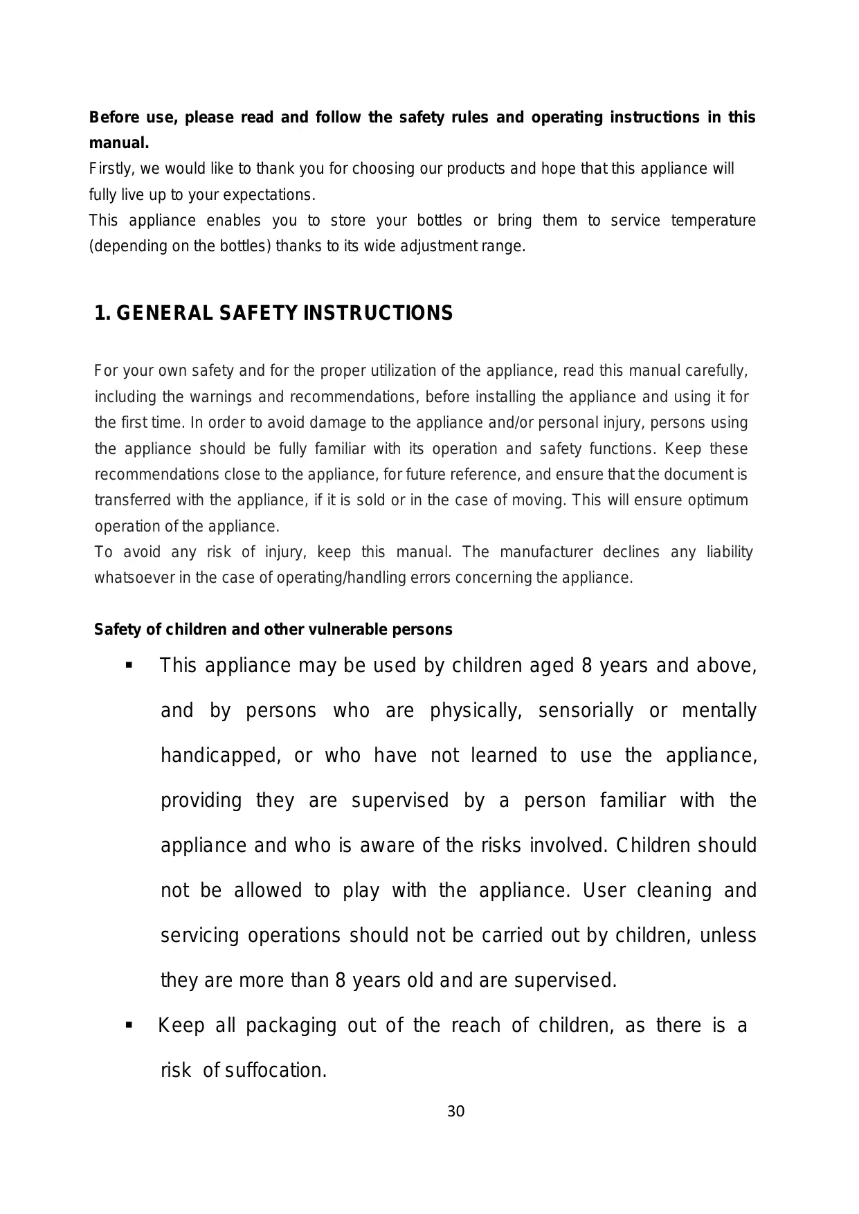 For your own safety and for the proper utilization of the appliance, read this manual carefully, including the warnings and recommendations, before installing the appliance and using it for the first time. In order to avoid damage to the appliance and/or personal injury, persons using the appliance should be fully familiar with its operation and safety functions. Keep these recommendations close to the appliance, for future reference, and ensure that the document is transferred with the appliance, if it is sold or in the case of moving. This will ensure optimum operation of the appliance.