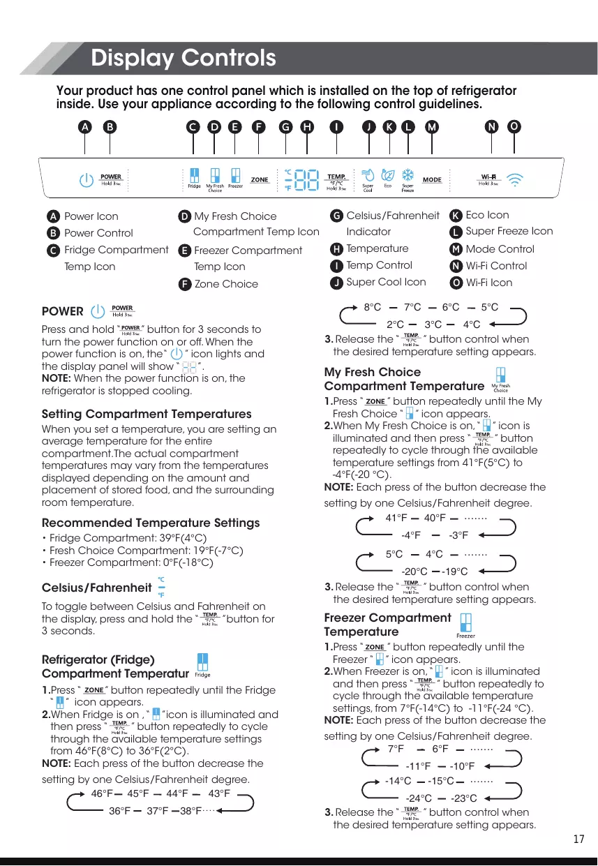 Recommended Temperature Settings • Fridge Compartment: 39°F(4°C) • Fresh Choice Compartment: 19°F(-7°C) • Freezer Compartment: 0°F(-18°C)