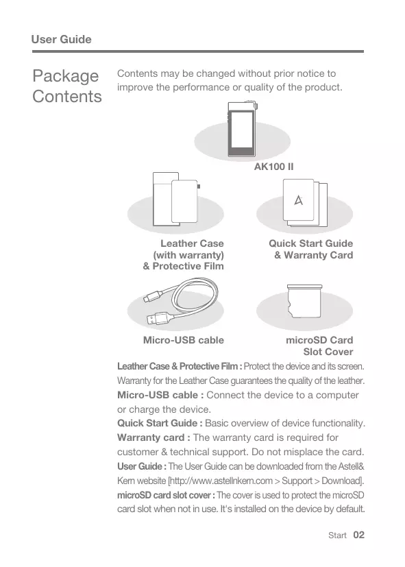 Quick Start Guide : Basic overview of device functionality. Warranty card : The warranty card is required for customer & technical support. Do not misplace the card. User Guide : The User Guide can be downloaded from the Astell& Kern website [http://www.astellkem.com > Support > Download]. microSD card slot cover : The cover is used to protect the microSD card slot when not in use. It's installed on the device by default.