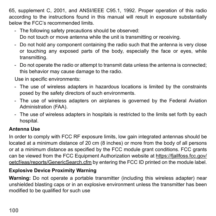 65, supplement C, 2001, and ANSI/IEEE C95.1, 1992. Proper operation of this radio according to the instructions found in this manual will result in exposure substantially below the FCC’s recommended limits. - The following safety precautions should be observed: Do not touch or move antenna while the unit is transmitting or receiving. - Do not hold any component containing the radio such that the antenna is very close or touching any exposed parts of the body, especially the face or eyes, while transmitting. - Do not operate the radio or attempt to transmit data unless the antenna is connected; this behavior may cause damage to the radio. Use in specific environments: - The use of wireless adapters in hazardous locations is limited by the constraints posed by the safety directors of such environments. - The use of wireless adapters on airplanes is governed by the Federal Aviation Administration (FAA). - The use of wireless adapters in hospitals is restricted to the limits set forth by each hospital. Antenna Use In order to comply with FCC RF exposure limits, low gain integrated antennas should be located at a minimum distance of 20 cm (8 inches) or more from the body of all persons or at a minimum distance as specified by the FCC module grant conditions. FCC grants can be viewed from the FCC Equipment Authorization website at https://fjallfoss.fcc.gov/ oetcf/eas/reports/GenericSearch.cfm by entering the FCC ID printed on the module label. Explosive Device Proximity Warning Warning: Do not operate a portable transmitter (including this wireless adapter) near unshielded blasting caps or in an explosive environment unless the transmitter has been modified to be qualified for such use