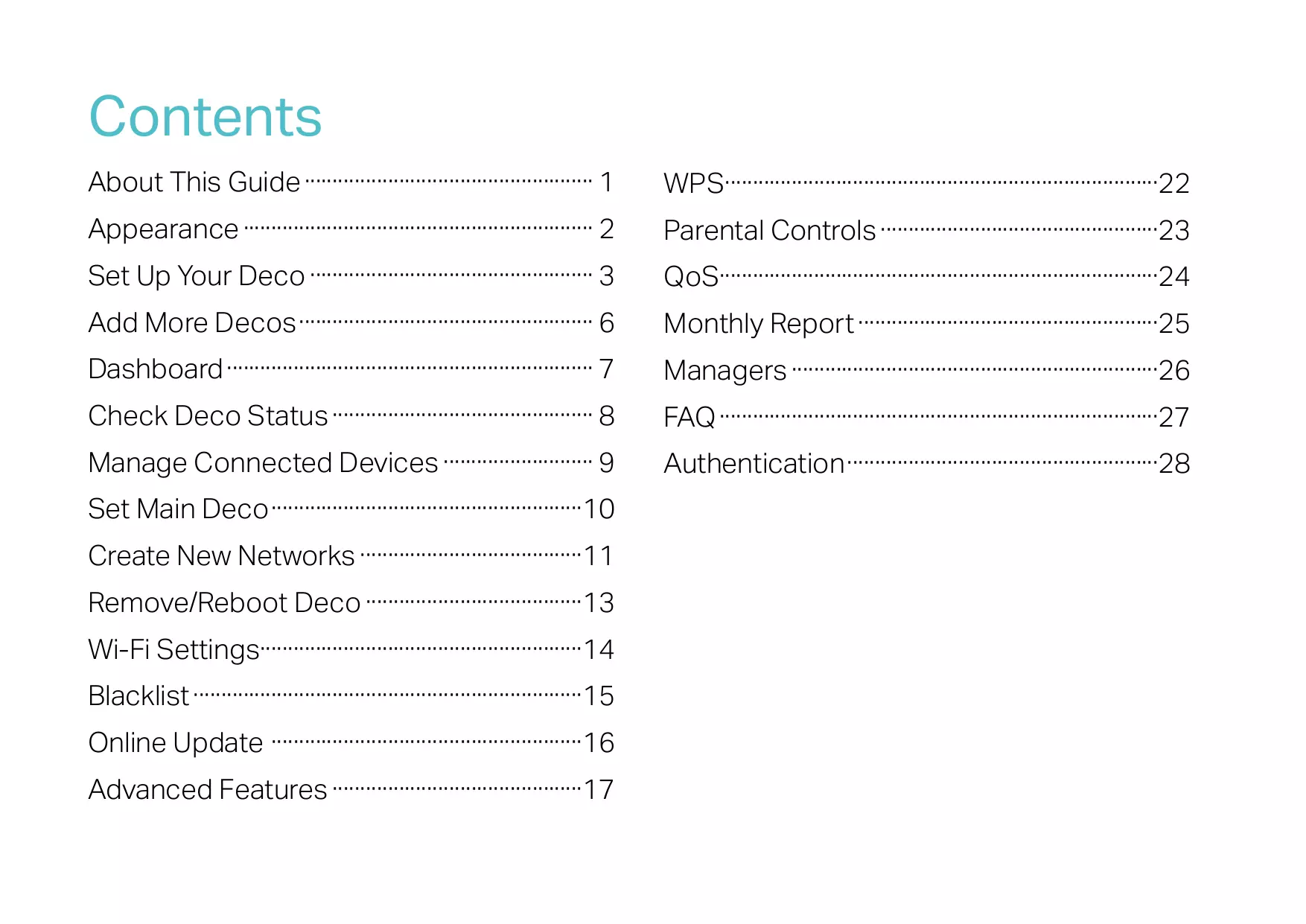Whole Home Mesh Wi-Fi 6 System Seamless Roaming | Parental Controls | Easy Setup User Guide AC1200 Whole Home Mesh Wi-Fi System Deco E4/W2400 1910012953 REV2.0.0 Contents About This Guide····················································· 1 WPS···············································································22 Set Up Your Deco···················································· 3 QoS···············································································24 Appearance································································ 2 Add More Decos······················································ 6 Dashboard··································································· 7 Check Deco Status················································ 8 Manage Connected Devices···························· 9 Set Main Deco·························································10 Create New Networks·········································11 Remove/Reboot Deco········································13 Wi-Fi Settings··························································14 Blacklist·······································································15 Online Update ·························································16 Advanced Features··············································17 Parental Controls···················································23 Monthly Report·······················································25 Managers···································································26 FAQ················································································27 Authentication·························································28 About This Guide This guide provides a brief introduction to Deco Whole Home Mesh Wi-Fi System and the Deco app, as well as regulatory information. Features available in Deco may vary by model and software version. Deco availability may also vary by region or ISP. All images, steps, and descriptions in this guide are only examples and may not reflect your actual Deco experience. Conventions In this guide, the following conventions are used: Convention Description Deco Stands for Deco Whole Home Mesh Wi-Fi System/Unit. Underline Hyperlinks are in teal and underlined. You can click to redirect to a website or a specific section. Teal Key information appears in teal, including management page text such as menus, items, buttons and so on. Note: Ignoring this type of note might result in a malfunction or damage to the device. Tips: Indicates important information that helps you make better use of your device. More Info