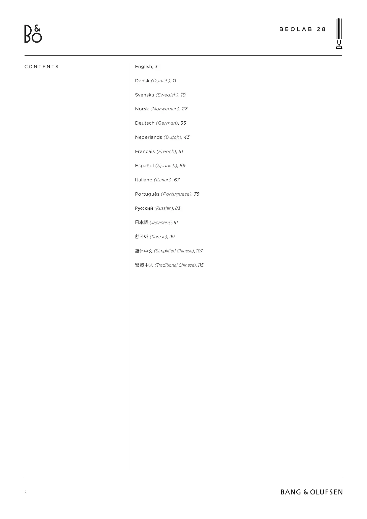 & Olufsen. Todo esto se hace a través de la aplicación Bang & Olufsen. Cuando configure su Beolab 28 como un par estéreo, asegúrese de que todos los cables de entrada estén conectados al mismo altavoz, que debe configurarse como el altavoz primario del par.