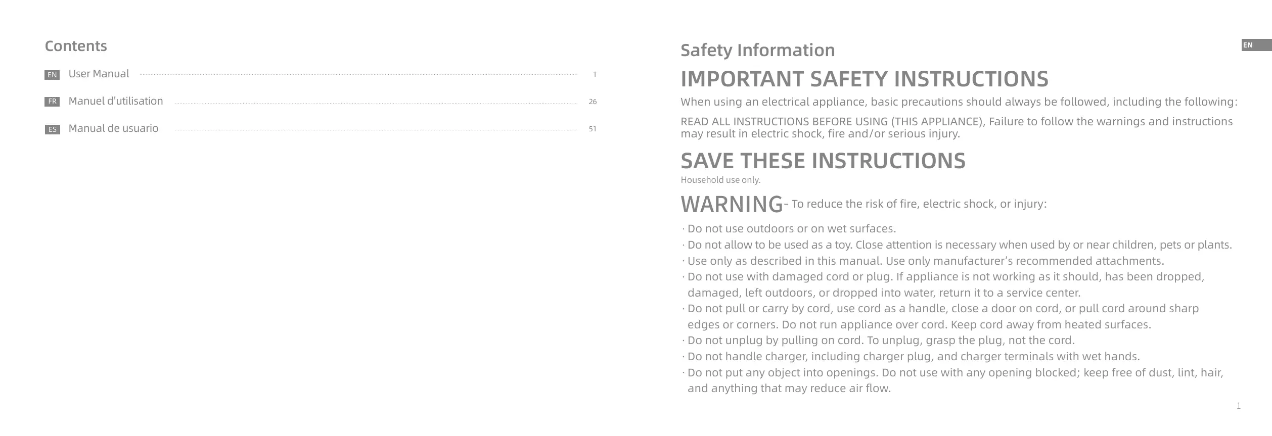 Household use only. WARNING– To reduce the risk of fire, electric shock, or injury: