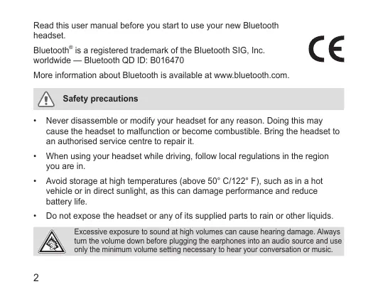 Read this user manual before you start to use your new Bluetooth headset. Bluetooth® is a registered trademark of the Bluetooth SIG, Inc. worldwide — Bluetooth QD ID: B016470 More information about Bluetooth is available at www.bluetooth.com. Safety precautions •• Never disassemble or modify your headset for any reason. Doing this may cause the headset to malfunction or become combustible. Bring the headset to an authorised service centre to repair it. •• When using your headset while driving, follow local regulations in the region you are in. •• Avoid storage at high temperatures (above 50° C/122° F), such as in a hot vehicle or in direct sunlight, as this can damage performance and reduce battery life. •• Do not expose the headset or any of its supplied parts to rain or other liquids. xcessive exposure to sound at high volumes can cause hearing damage. Always E turn the volume down before plugging the earphones into an audio source and use only the minimum volume setting necessary to hear your conversation or music.