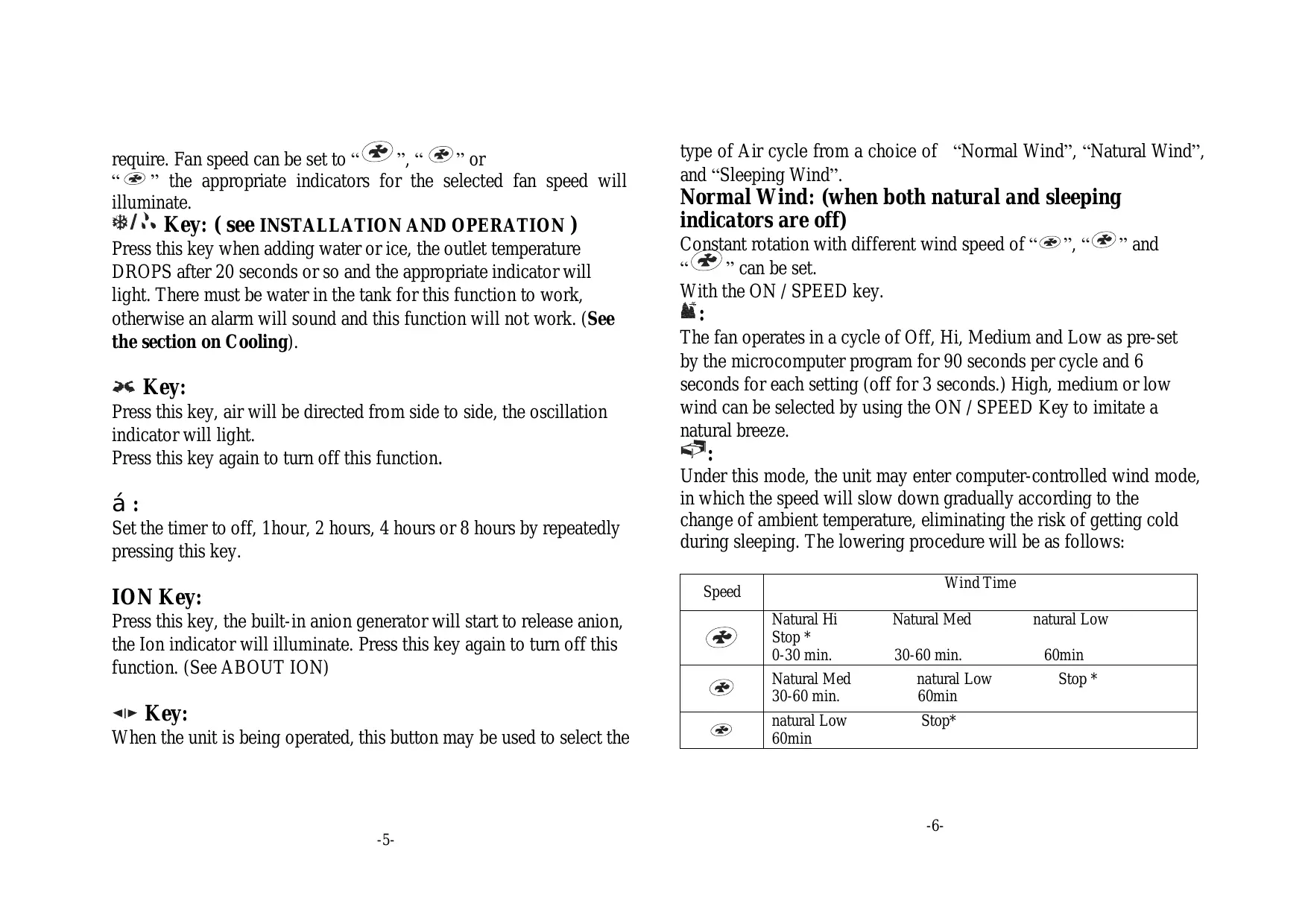 require. Fan speed can be set to " " , " ⑥ " or " ⑥ " the appropriate indicators for the selected fan speed will illuminate. 念 /念 Key: ( see INSTALLATION AND OPERATION ) Press this key when adding water or ice, the outlet temperature DROPS after 20 seconds or so and the appropriate indicator will light. There must be water in the tank for this function to work, otherwise an alarm will sound and this function will not work. (See the section on Cooling).