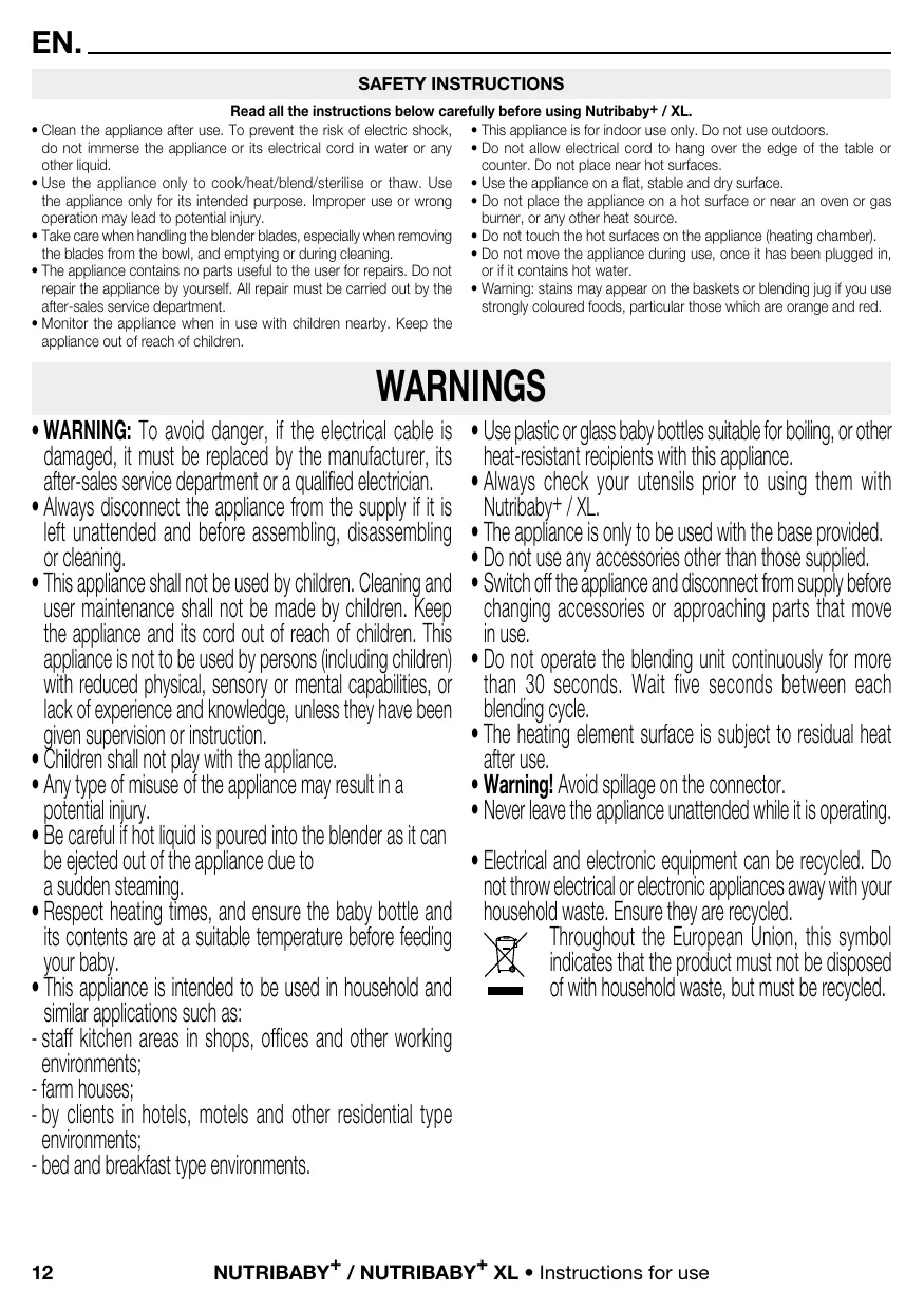 - d es environnements du type de chambres d’hôtes. • Utilisez des biberons en plastique ou en verre pouvant bouillir ou tous autres récipients thermorésistants avec cet appareil. • Vérifiez toujours vos ustensiles avant de les employer avec le Nutribaby+ / XL. • L 'appareil doit seulement être utilisé avec la base fournie. • N e pas utiliser d'accessoires autres que ceux fournis. • Éteignez l'appareil et déconnectez le câble avant de changer des accessoires ou d'approcher des pièces en mouvement pendant l'utilisation. • Ne faites pas fonctionner l'unité de mixage en continu pendant plus de 30 secondes. Attendez cinq secondes entre chaque cycle de mixage. • La surface de l'élément chauffant est soumise à la chaleur résiduelle après utilisation. • A vertissement! Évitez les déversements sur le connecteur. • Ne laissez jamais l'appareil sans surveillance pendant son fonctionnement. • Les équipements électriques et électroniques font l’objet d’une collecte sélective. Ne pas se débarrasser des déchets d’équipements électriques et électroniques avec les déchets municipaux non triés, mais procéder à leur collecte sélective. Ce symbole indique à travers l’Union Européenne que ce produit ne doit pas être jeté à la poubelle ou mélangé aux ordures ménagères, mais faire l’objet d’une collecte sélective.