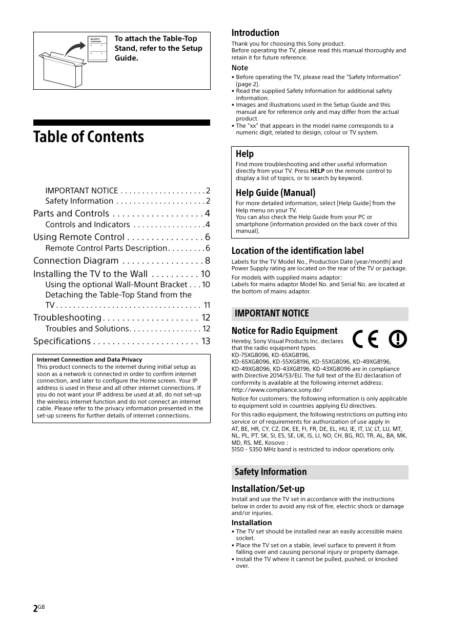 équipements radio Le soussigné, Sony Visual Products Inc., déclare que les équipements radioélectriques de type KD-75XG8096, KD-65XG8196, KD-65XG8096, KD-55XG8196, KD-55XG8096, KD-49XG8196, KD-49XG8096, KD-43XG8196, KD-43XG8096 sont conformes à la directive 2014/53/UE. Le texte complet de la déclaration UE de conformité est disponible à l’adresse internet suivante: http://www.compliance.sony.de/ Avis aux clients : les informations suivantes s’appliquent uniquement aux appareils vendus dans les pays qui appliquent les directives de l’UE. Pour cet équipement radio, les restrictions de mise en service ou de demandes d’autorisation d’utilisation suivantes s’appliquent en AT, BE, HR, CY, CZ, DK, EE, FI, FR, DE, EL, HU, IE, IT, LV, LT, LU, MT, NL, PL, PT, SK, SI, ES, SE, UK, IS, LI, NO, CH, BG, RO, TR, AL, BA, MK, MD, RS, ME, Kosovo : La bande 5 150-5 350 MHz est limitée aux utilisations en intérieur uniquement. Installation/Mise en place Installez et utilisez le téléviseur conformément aux instructions ci-dessous afin d’éviter tout risque d’incendie, d’électrocution ou autre dommage et/ou blessure.