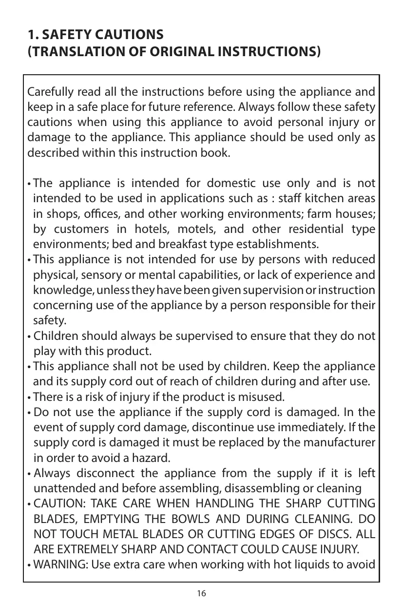1. SAFETY CAUTIONS (TRANSLATION OF ORIGINAL INSTRUCTIONS) Carefully read all the instructions before using the appliance and keep in a safe place for future reference. Always follow these safety cautions when using this appliance to avoid personal injury or damage to the appliance. This appliance should be used only as described within this instruction book. • The appliance is intended for domestic use only and is not intended to be used in applications such as : staff kitchen areas in shops, offices, and other working environments; farm houses; by customers in hotels, motels, and other residential type environments; bed and breakfast type establishments. • This appliance is not intended for use by persons with reduced physical, sensory or mental capabilities, or lack of experience and knowledge, unless they have been given supervision or instruction concerning use of the appliance by a person responsible for their safety. • Children should always be supervised to ensure that they do not play with this product. • This appliance shall not be used by children. Keep the appliance and its supply cord out of reach of children during and after use. • There is a risk of injury if the product is misused. • Do not use the appliance if the supply cord is damaged. In the event of supply cord damage, discontinue use immediately. If the supply cord is damaged it must be replaced by the manufacturer in order to avoid a hazard. • Always disconnect the appliance from the supply if it is left unattended and before assembling, disassembling or cleaning • CAUTION: TAKE CARE WHEN HANDLING THE SHARP CUTTING BLADES, EMPTYING THE BOWLS AND DURING CLEANING. DO NOT TOUCH METAL BLADES OR CUTTING EDGES OF DISCS. ALL ARE EXTREMELY SHARP AND CONTACT COULD CAUSE INJURY. • WARNING: Use extra care when working with hot liquids to avoid 16