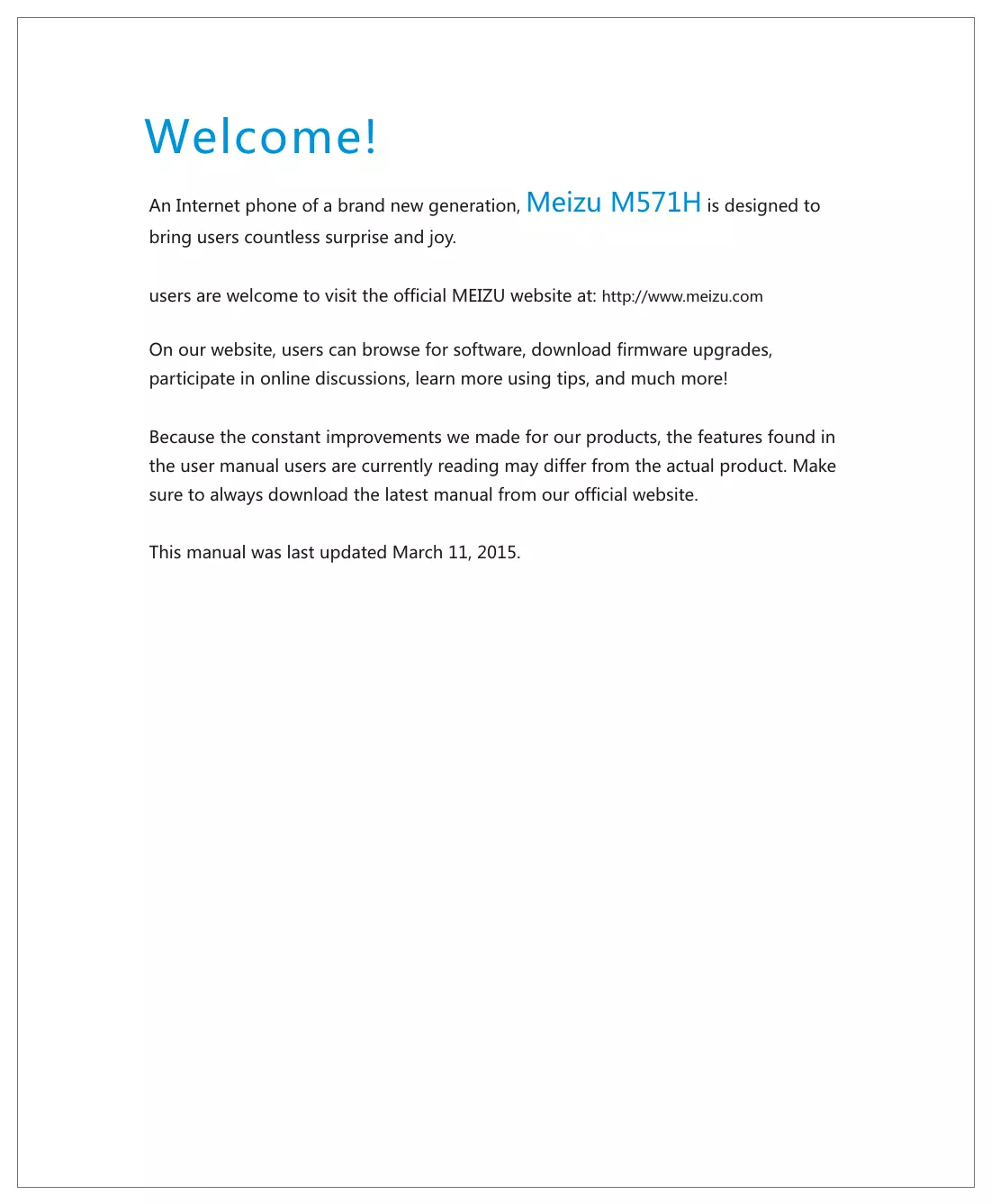 • M571H USER MANUAL Welcome! An Internet phone of a brand new generation, Meizu M571H is designed to bring users countless surprise and joy. users are welcome to visit the official MEIZU website at: http://www.meizu.com On our website, users can browse for software, download firmware upgrades, participate in online discussions, learn more using tips, and much more! Because the constant improvements we made for our products, the features found in the user manual users are currently reading may differ from the actual product. Make sure to always download the latest manual from our official website. This manual was last updated March 11, 2015. Legal information © 2003-2012 Meizu Inc. All rights reserved. Meizu and the Meizu logo are trademarks belonging to Meizu both in the PRC and overseas. Google, Google logo, Android, Google search, Gmail, Google Mail and Android Market are trademarks of Google, Inc. Street View Images © 2010 Google. Bluetooth and the Bluetooth logo are trademarks of Bluetooth SIG, Inc. Java, J2ME and all other Java-based trademarks are registered trademarks belonging to Sun Microsystems, Inc. in the United States and other countries. Meizu (or Meizu's licensors) own all legal rights to the product, trademarks and interests, including but not limited to any intellectual property rights found in services (whether those rights have been registered, and regardless of where in the world those rights may exist). Meizu company services may include information designated as confidential. Without the prior written consent of Meizu; transcription, replication, reproduction or translation of some or all of said contents are prohibited. Users who disregard legal boundaries and use the product to for illegal activities, bears the full legal responsibility for their actions. Please take note of the software license agreement for Meizu and third-party software pertaining to the installation and updating of the software. The manufacturers and importers do not take any responsibility for accidental damage to the device (including human error or other force majeure). Meizu does not undertake errors or omissions in this document for any liability arising, Meizu company will continue to provide new product development success This document is subject to change without notice. Meizu is committed to improvie its products to better meet consumer demand. Please read through the contents of this document before the use of this product. Product features may change with time. To obtain the latest product information, please visit http://en.meizu.com. All references to other companies, products and services names are trademarks or service marks of their respective owners. The Quick Start Guide is for reference only.Actual features are subject to change depending on the preinstalled operating system version. For more detailed information over features and safety precautions, please refer to Tips in the operating system. 2003-2014 Meizu Technology Co.,Lrd.All rights reservedMEIZU and MEIZU logo are trademarks of Meizu Technology Co.,Ltd.in china and other countries. Meizu Technology Co.,Ltd. declares that this device is in compliance with the essential requirements and other relevant provisions of directive 1999/5/EC. Table of Contents Important Notices p. 7