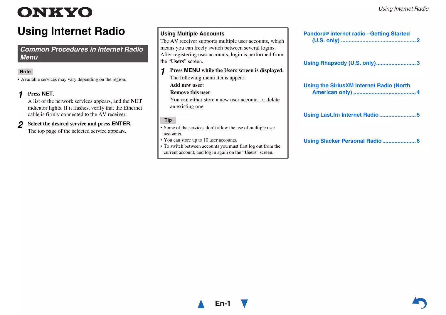 • Si vous souhaitez utiliser plusieurs comptes utilisateur, consultez « Utilisation de plusieurs comptes » (➔ page 1). L’identification peut être réalisée à partir de l’écran Vous pouvez lire des pistes des artistes les mieux évalués. Top Tags Station : Vous pouvez lire des pistes des tags les mieux évalués. Personal Station : Vous pouvez lire des pistes de votre station personnalisée (« Your Library », « Your Neighbourhood » et « Your Recommendations »).