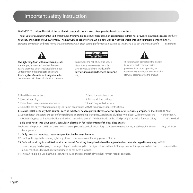 R2000DB Multimedia Speaker User manual | Manuel d’utilisateur | Manual de usuario | Bedienungsanleitung | Manuale dell’utente | Manual do utilizador Important safety instruction products ent, his system. personal computer, and mini home theater systems with great sound performance. Please read this manual to get the most out of t thetriangle, is intended to alert the user to the presence of un-insulated dangerous voltage within the product's enclosure To prevent the risk of electric shock, do not remove cover (or back). No user-serviceable Parts inside. Refer only. The exclamation point inside the triangle is intended to alert the user to the presence of important operating and maintenance(servicing) instructions in the literature accompanying the product. constitute a risk of electric shock to persons.