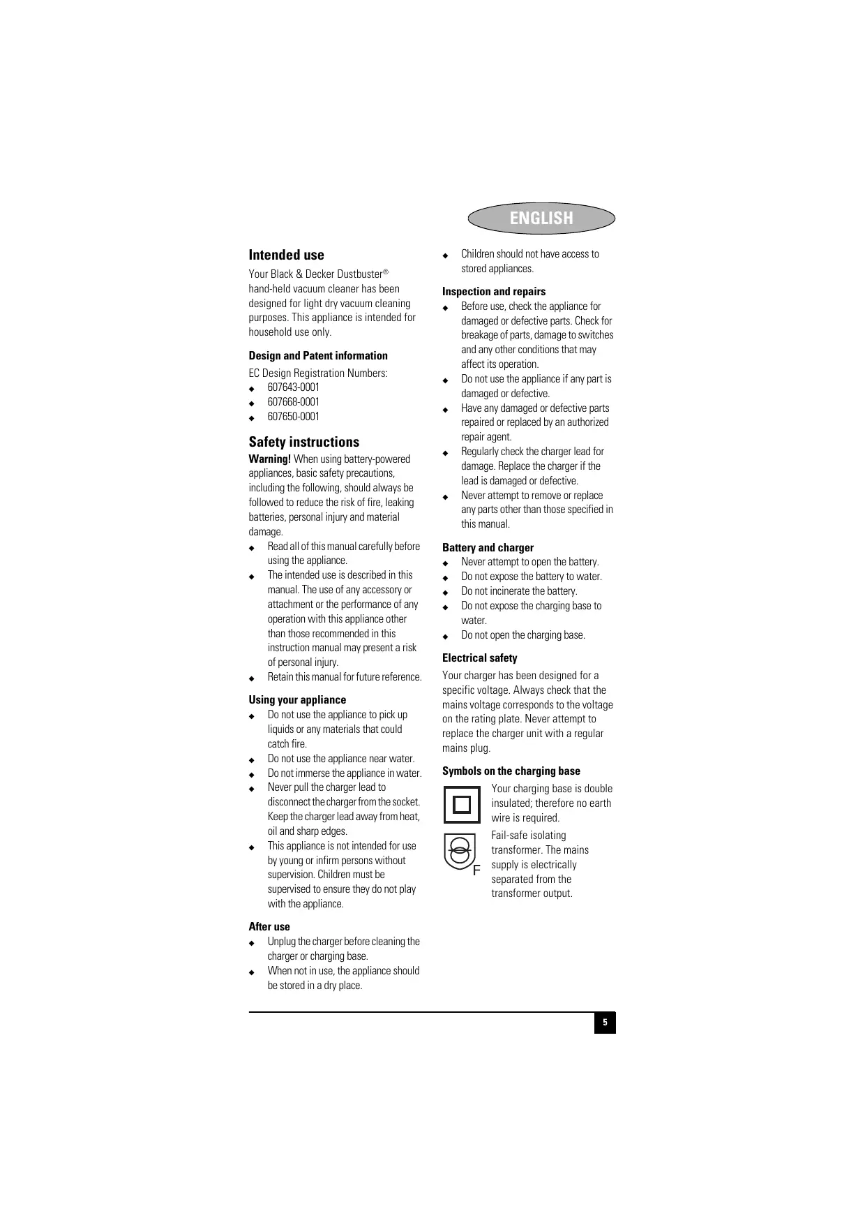 8 Avant l’utilisation, vérifiez si l'appareil est en bon état ou si aucune pièce ne manque. Recherchez des pièces cassées, des boutons endommagés et d'autres anomalies susceptibles de nuire au bon fonctionnement de l’appareil. 8 N’utilisez pas l’appareil si une pièce est endommagée ou défectueuse. 8 Faites réparer ou remplacer les pièces défectueuses ou endommagées par un réparateur agréé. 8 Vérifiez régulièrement l’état du fil du chargeur. Si le fil est endommagé ou défectueux, remplacez le chargeur. 8 Ne tentez jamais de retirer ou de remplacer des pièces autres que celles citées dans ce manuel. Batterie et chargeur 8 N’essayez jamais d’ouvrir la batterie. 8 Ne mettez pas la batterie en contact avec l’eau. 8 Ne jetez pas la batterie au feu. 8 Ne mettez pas le support de charge en contact avec l’eau. 8 Ne démontez pas le support de charge. Sécurité électrique Votre chargeur doit être utilisé avec une tension précise. Vérifiez toujours si le voltage indiqué sur la plaque signalétique de l’appareil correspond à la tension de secteur. N’essayez jamais de remplacer le chargeur par une prise secteur. Symboles sur le support de charge Votre support de charge est doublement isolé; par conséquent, aucun câble de masse n'est nécessaire.