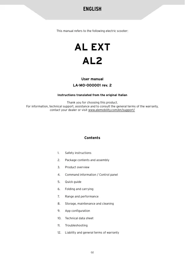 N'utilisez pas d'accessoires et / ou de pièces supplémentaires non approuvés par le fabricant. Tenez les enfants à l'écart des pièces en plastique (y compris les matériaux d'emballage) et des petites pièces qui peuvent provoquer une suffocation. Il est interdit de modifier ou de transformer le produit ou ses parties de quelque manière que ce soit, car cela pourrait nuire à l'efficacité, à la structure et causer des dommages. Si vous détectez des défauts d'usine, des bruits inhabituels ou des anomalies, ne conduisez pas le véhicule et contactez votre concessionnaire ou visitez le site www.alemobility.com/en/ pour bénéficier de l’assistance technique.