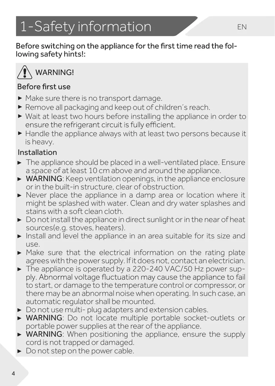 être éclaboussé par de l’eau. Nettoyez et essuyez les éclaboussures et les taches d’eau avec un chiffon doux et propre. f N’installez pas l’appareil à la lumière directe du soleil ou à proximité de sources de chaleur (par exemple, des cuisinières, des radiateurs). f Installez et mettez l’appareil à niveau dans un endroit adapté à sa taille et à son utilisation. f Assurez-vous que les informations électriques figurant sur la plaque signalétique correspondent à l’alimentation électrique. Si ce n’est pas le cas, contactez un électricien. f L’appareil fonctionne avec une alimentation électrique de 220‑240 VAC/50 Hz. Une fluctuation anormale de la tension peut empêcher le démarrage de l’appareil, endommager le régulateur de température ou le compresseur ou provoquer un bruit anormal lors du fonctionnement. Dans ce cas, un régulateur automatique doit être monté. f N’utilisez pas d’adaptateurs multiprises ni de rallonges. f AVERTISSEMENT : ne placez pas de multiprises ni de blocs d'alimentation à l'arrière de l'appareil. f AVERTISSEMENT : lors de l’installation de l'appareil, veillez à ce que le cordon d'alimentation ne soit pas coincé ni endommagé. f N’écrasez pas le câble d’alimentation.