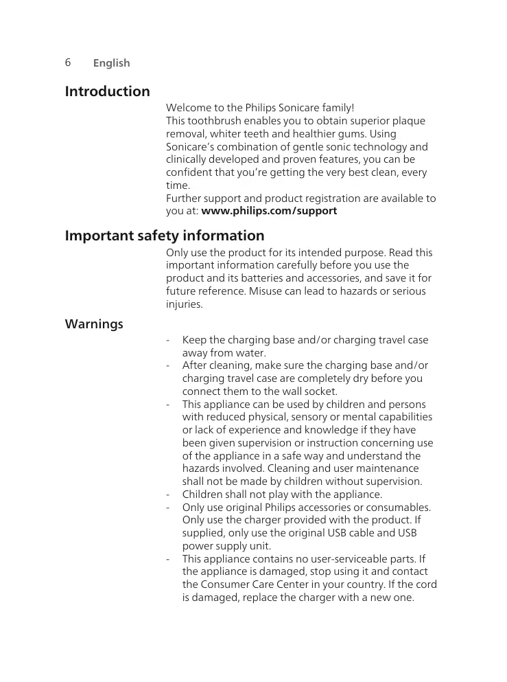 N'utilisez pas le socle de charge et/ou le coffret de voyage à l'extérieur ou près de surfaces chauffantes. Ne nettoyez aucune pièce du produit au lave-vaisselle. Cet appareil a été conçu uniquement pour le brossage des dents, des gencives et de la langue. Cessez d’utiliser une tête de brosse dont les brins sont écrasés ou tordus. Remplacez la tête de brosse tous les 3 mois ou plus tôt si vous constatez des signes d’usure. Evitez tout contact direct avec des produits qui contiennent des huiles essentielles ou de l'huile de coprah. Ce contact peut déloger les brins de la brosse à dents. Cessez d’utiliser l’appareil et consultez votre dentiste/médecin en cas de saignement excessif après utilisation, si le saignement persiste après une semaine d’utilisation ou si vous ressentez une gêne ou une douleur. Si vous avez reçu des soins bucco-dentaires, notamment au niveau des gencives, au cours des deux derniers mois, consultez votre dentiste avant d'utiliser cet appareil. Si vous portez un stimulateur cardiaque ou tout autre dispositif implanté, consultez votre médecin ou le fabricant de votre dispositif avant d’utiliser cet appareil. Si vous avez des problèmes de santé, consultez votre médecin avant d'utiliser cet appareil. Cet appareil de soins est personnel et n’est pas destiné à être utilisé sur plusieurs patients dans les cabinets ou établissements dentaires.