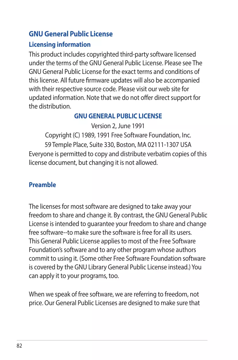 GNU General Public License Licensing information This product includes copyrighted third-party software licensed under the terms of the GNU General Public License. Please see The GNU General Public License for the exact terms and conditions of this license. All future firmware updates will also be accompanied with their respective source code. Please visit our web site for updated information. Note that we do not offer direct support for the distribution.