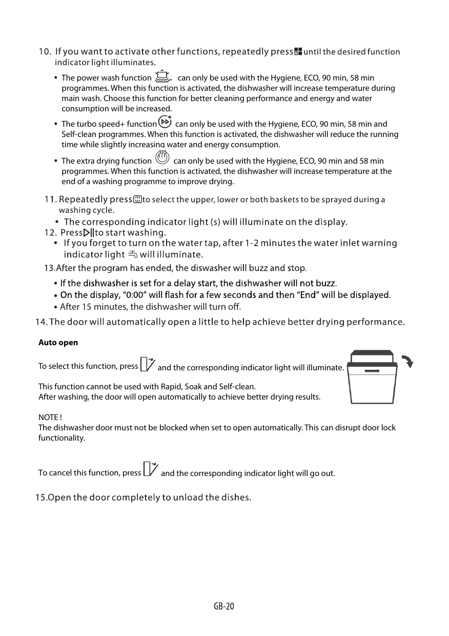 Cette fonction ne peut pas être utilisée avec les modes Rapide, Trempage et Autonettoyage. Après le lavage, la porte s'ouvrira automatiquement pour obtenir de meilleurs résultats de séchage. REMARQUE ! La porte du lave-vaisselle ne doit pas être bloquée lorsqu'elle est réglée pour s'ouvrir automatiquement. Cela peut perturber la fonctionnalité de verrouillage de la porte. Pour annuler cette fonction, appuyez sur la touche