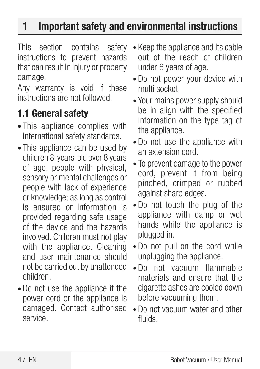 the appliance against precipitation, humidity and heat sources. • Do not use the appliance in or near explosive or flammable environments and substances. • Unplug the appliance before cleaning and maintenance. • This product is not designed for commercial use, it is intended for use at home and in applications as follows: – In the staff kitchens of the stores, offices and other working environments, – In farm houses, – By customers in hotels, motels or other accommodation facilities; – In hostels, or similar environments. – Sleeping places and breakfast environments • Do not immerse the appliance or its power cord in water for cleaning. • Do not disassemble the appliance. Robot Vacuum / User Manual