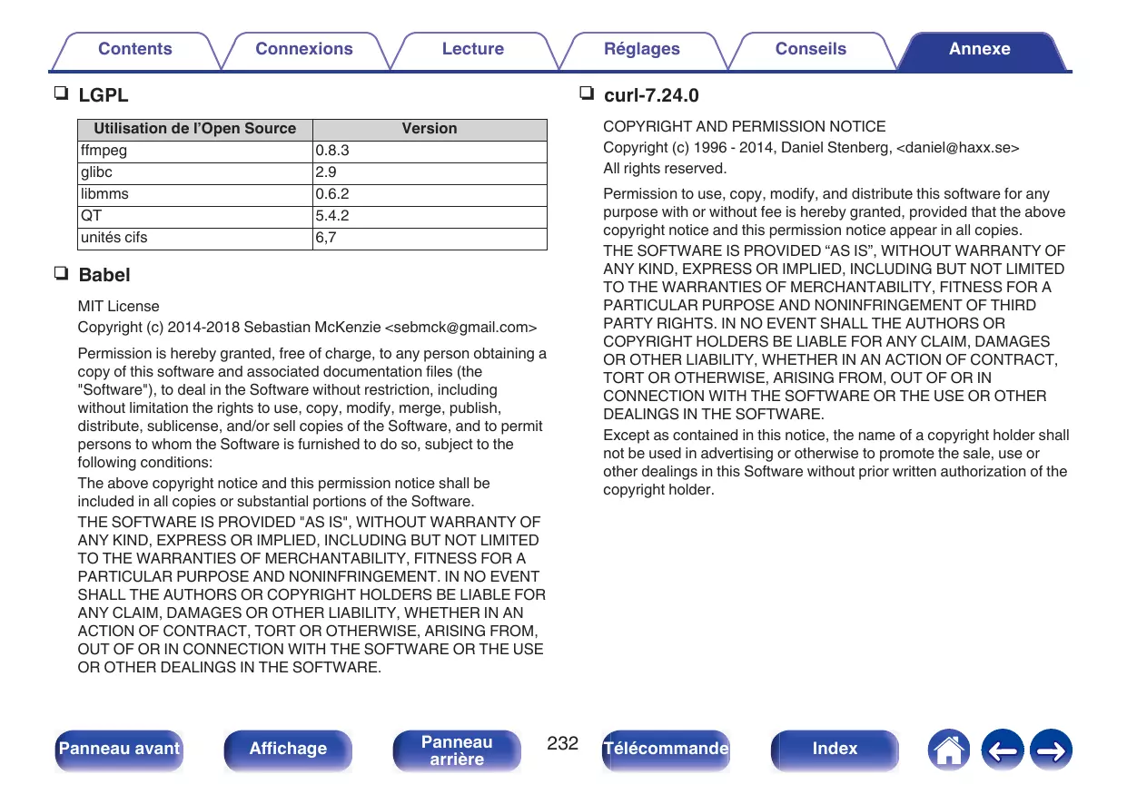 Denon fournit le code source basé sur les licences GPL et LPGL au coût réel à la demande de notre centre de service client. Cependant, notez que nous ne fournissons aucune garantie en ce qui concerne le code source. Veuillez également noter que nous n’offrons aucune aide pour le contenu du code source.