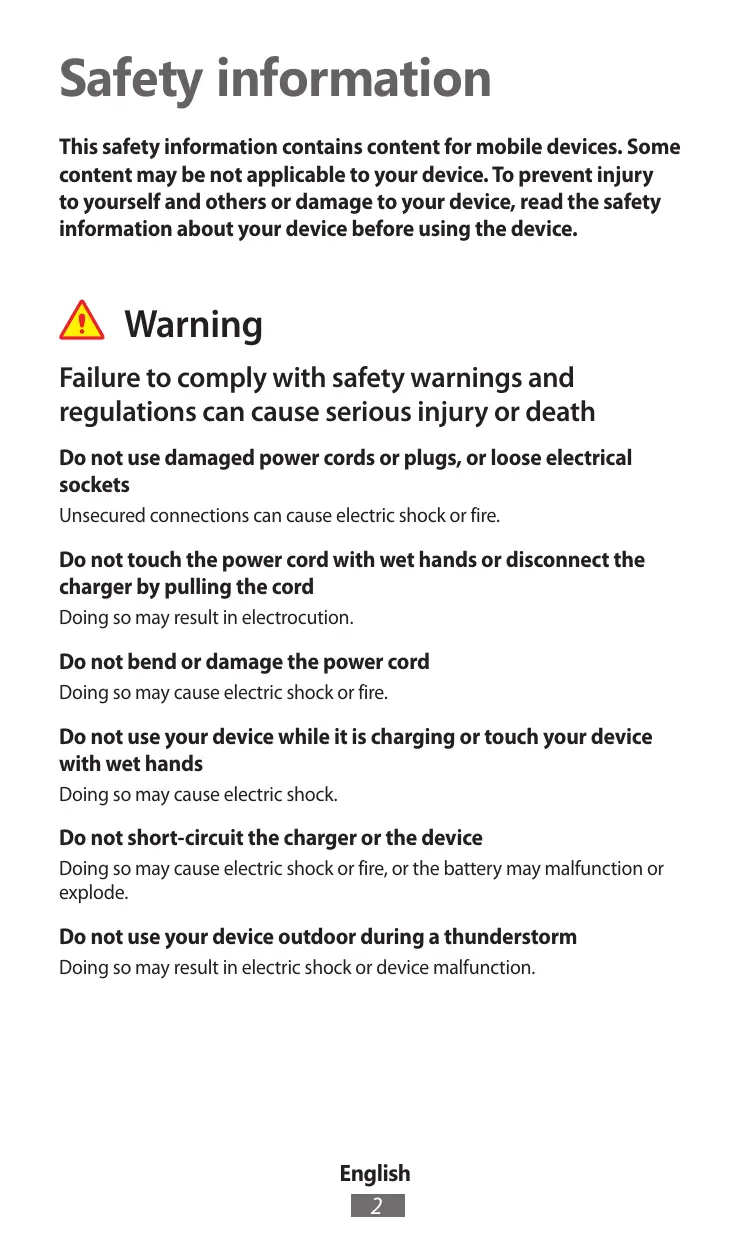 Safety information This safety information contains content for mobile devices. Some content may be not applicable to your device. To prevent injury to yourself and others or damage to your device, read the safety information about your device before using the device. Warning Failure to comply with safety warnings and regulations can cause serious injury or death Do not use damaged power cords or plugs, or loose electrical sockets Unsecured connections can cause electric shock or fire. Do not touch the power cord with wet hands or disconnect the charger by pulling the cord Doing so may result in electrocution. Do not bend or damage the power cord Doing so may cause electric shock or fire. Do not use your device while it is charging or touch your device with wet hands Doing so may cause electric shock. Do not short-circuit the charger or the device Doing so may cause electric shock or fire, or the battery may malfunction or explode. Do not use your device outdoor during a thunderstorm Doing so may result in electric shock or device malfunction. English