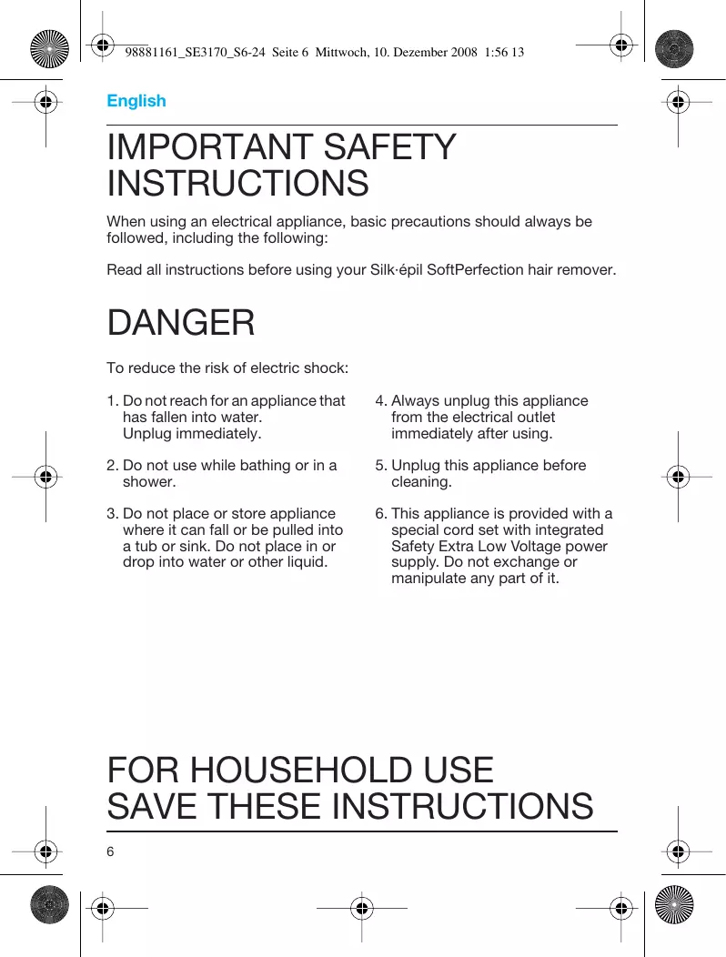 8. Toujours relier la fiche à l’appareil avant de brancher sur la prise de courant. Pour débrancher, placer l’interrupteur à « arrêt », puis retirer la fiche de la prise. 9. Utiliser seulement le cordon d’alimentation spécial fourni avec l’épilateur Silk·épil SoftPerfection.