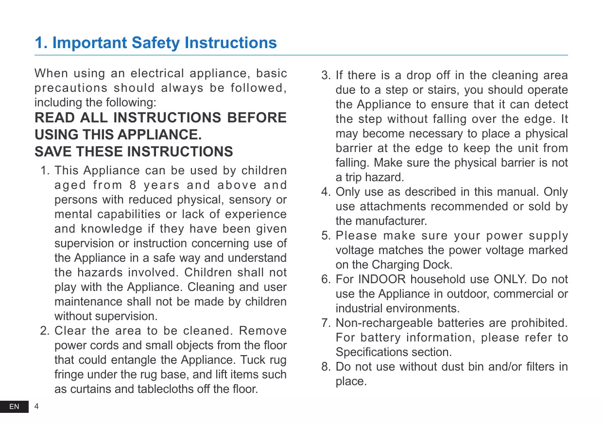 3. If there is a drop off in the cleaning area due to a step or stairs, you should operate the Appliance to ensure that it can detect the step without falling over the edge. It may become necessary to place a physical barrier at the edge to keep the unit from falling. Make sure the physical barrier is not a trip hazard. 4. Only use as described in this manual. Only use attachments recommended or sold by the manufacturer. 5. Please make sure your power supply voltage matches the power voltage marked on the Charging Dock. 6. For INDOOR household use ONLY. Do not use the Appliance in outdoor, commercial or industrial environments. 7. Non-rechargeable batteries are prohibited. For battery information, please refer to Specifications section. 8. Do not use without dust bin and/or filters in place.