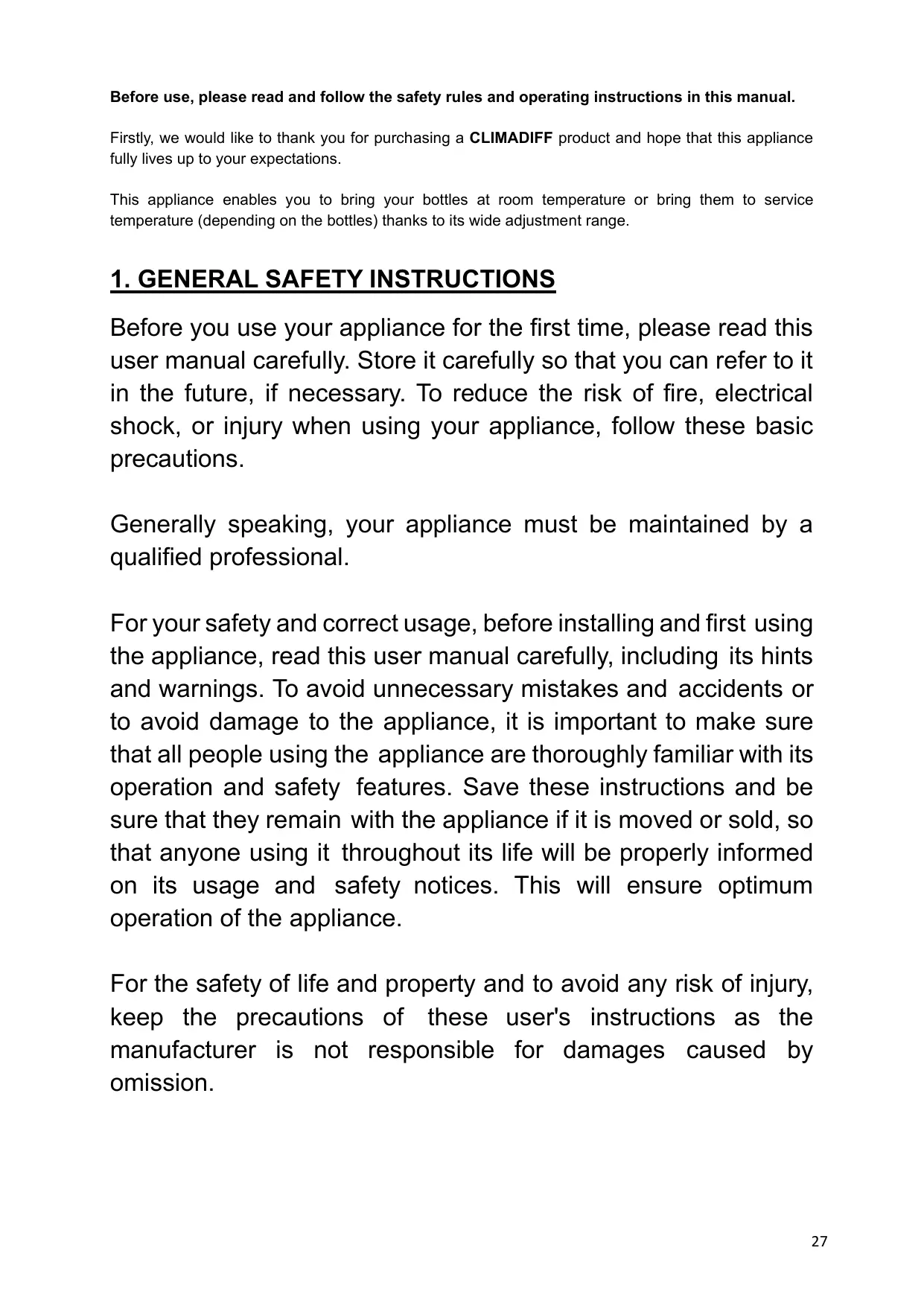 Avant d’utiliser votre appareil pour la première fois, veuillez lire attentivement ce manuel d’utilisation. Conservez-le précieusement de façon à pouvoir vous y référer au besoin. Afin de réduire le risque d’incendie, de choc électrique ou de blessure lors de l’utilisation de votre cave, merci de suivre les précautions données. D'une manière générale, votre appareil doit être entretenu par un professionnel qualifié. Pour votre sécurité et pour une utilisation correcte de l’appareil, avant d’installer et d’utiliser l’appareil pour la première fois, lisez attentivement cette notice, y compris les mises en garde et les conseils utiles qu’elle contient. Afin d’éviter d’endommager l’appareil et/ou de vous blesser inutilement, il est important que les personnes amenées à utiliser cet appareil aient pris entièrement connaissance de son fonctionnement ainsi que de ses instructions de sécurité. Conservez ces consignes pour plus tard et pensez à les ranger à côté de l’appareil, afin qu’elles soient transmises avec ce dernier en cas de vente ou de déménagement. Cela permettra de garantir un fonctionnement optimal de l’appareil. Pour éviter tout risque de blessure, conservez cette notice. Le fabricant ne saurait en effet être tenu responsable en cas de mauvaise manipulation de l’appareil. Cet appareil est destiné exclusivement à un usage domestique et est prévu pour le stockage de boissons spéciales à une 3