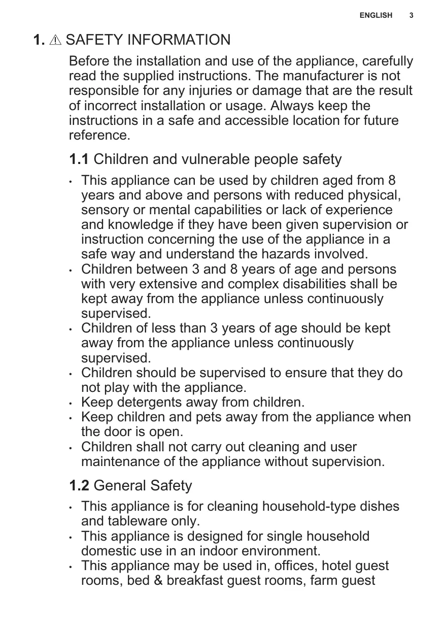 This appliance can be used by children aged from 8 years and above and persons with reduced physical, sensory or mental capabilities or lack of experience and knowledge if they have been given supervision or instruction concerning the use of the appliance in a safe way and understand the hazards involved. Children between 3 and 8 years of age and persons with very extensive and complex disabilities shall be kept away from the appliance unless continuously supervised. Children of less than 3 years of age should be kept away from the appliance unless continuously supervised. Children should be supervised to ensure that they do not play with the appliance. Keep detergents away from children. Keep children and pets away from the appliance when the door is open. Children shall not carry out cleaning and user maintenance of the appliance without supervision.