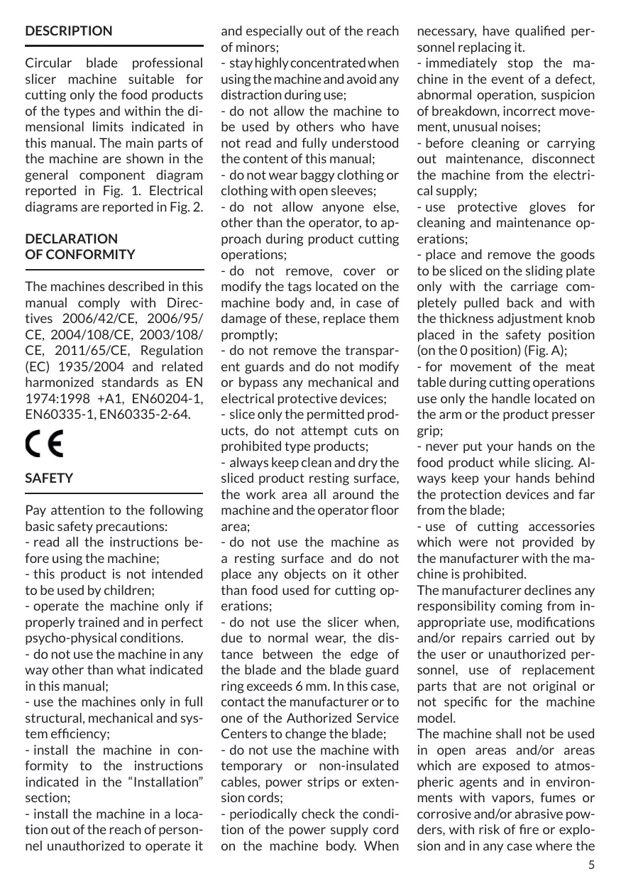 -- contrôlez régulièrement l’état du câble d’alimentation et du presse-étoupe sur le corps de la machine, remplacez-le rapidement si besoin et adressez-vous à du personnel qualifié pour l’intervention; -- arrêtez immédiatement la machine en cas de défaut, de fonctionnement anormal, de suspicion de rupture, de mouvements incorrects, de bruit insolite; -- avant d’exécuter le nettoyage ou d’effectuer des interventions d’entretien, débranchez la machine du réseau d’alimentation électrique; -- utilisez des gants de protections pour les opérations de nettoyage et d’entretien; -- placez et retirez le produit à découper sur le plat coulissant uniquement avec le chariot entièrement reculé et avec la poignée de réglage de l’épaisseur placée en sécurité (Fig. A); -- pour le déplacement du plat porte-aliment pendant l’opération de découpe, utilisez uniquement la poignée de manœuvre placée sur le bras ou la prise du presse-aliment; -- l’utilisation d’accessoires pour la découpe qui n’ont pas été fournis par le constructeur avec la machine n’est pas autorisé. Le fabricant décline toute responsabilité directe ou indirecte dérivant d’utilisation non conforme, modifications et/ou réparations non autorisées effectuées sur la machine; utilisation d’accessoires et de pièces de rechange non originales. La machine ne peut pas être utilisée dans des lieux ouverts et/ ou exposée aux agents atmos-