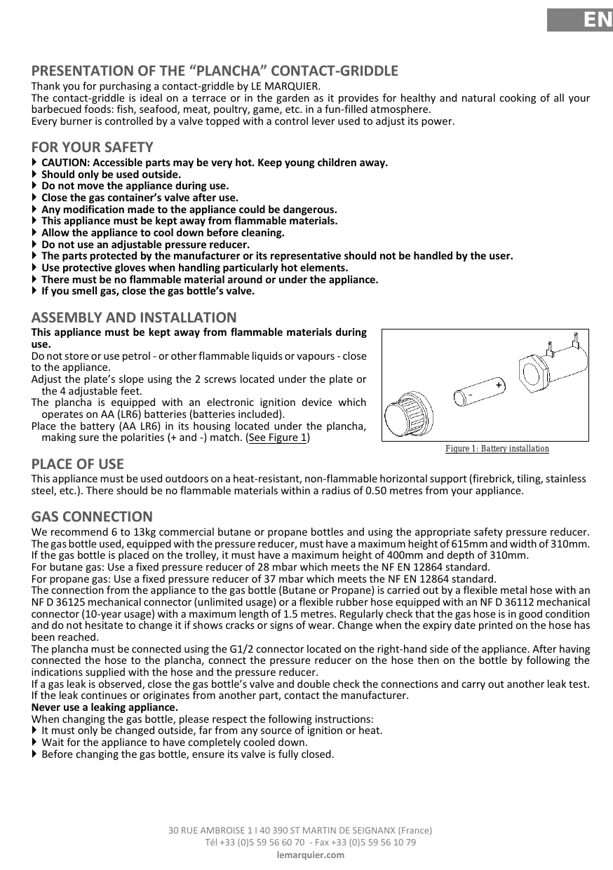 Thank you for purchasing a contact-griddle by LE MARQUIER. The contact-griddle is ideal on a terrace or in the garden as it provides for healthy and natural cooking of all your barbecued foods: fish, seafood, meat, poultry, game, etc. in a fun-filled atmosphere. Every burner is controlled by a valve topped with a control lever used to adjust its power.