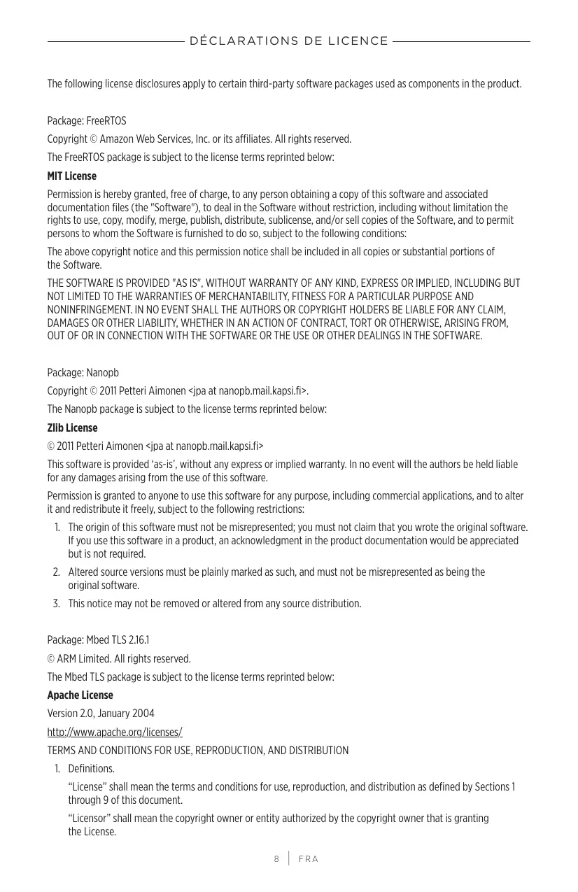 FRA D ÉCL A R AT ION S D E L I CEN C E The following license disclosures apply to certain third-party software packages used as components in the product. Package: FreeRTOS Copyright © Amazon Web Services, Inc. or its affiliates. All rights reserved. The FreeRTOS package is subject to the license terms reprinted below: MIT License Permission is hereby granted, free of charge, to any person obtaining a copy of this software and associated documentation files (the "Software"), to deal in the Software without restriction, including without limitation the rights to use, copy, modify, merge, publish, distribute, sublicense, and/or sell copies of the Software, and to permit persons to whom the Software is furnished to do so, subject to the following conditions: The above copyright notice and this permission notice shall be included in all copies or substantial portions of the Software. THE SOFTWARE IS PROVIDED "AS IS", WITHOUT WARRANTY OF ANY KIND, EXPRESS OR IMPLIED, INCLUDING BUT NOT LIMITED TO THE WARRANTIES OF MERCHANTABILITY, FITNESS FOR A PARTICULAR PURPOSE AND NONINFRINGEMENT. IN NO EVENT SHALL THE AUTHORS OR COPYRIGHT HOLDERS BE LIABLE FOR ANY CLAIM, DAMAGES OR OTHER LIABILITY, WHETHER IN AN ACTION OF CONTRACT, TORT OR OTHERWISE, ARISING FROM, OUT OF OR IN CONNECTION WITH THE SOFTWARE OR THE USE OR OTHER DEALINGS IN THE SOFTWARE. Package: Nanopb Copyright © 2011 Petteri Aimonen <jpa at nanopb.mail.kapsi.fi>. The Nanopb package is subject to the license terms reprinted below: Zlib License © 2011 Petteri Aimonen <jpa at nanopb.mail.kapsi.fi> This software is provided ‘as-is’, without any express or implied warranty. In no event will the authors be held liable for any damages arising from the use of this software. Permission is granted to anyone to use this software for any purpose, including commercial applications, and to alter it and redistribute it freely, subject to the following restrictions: 1. T he origin of this software must not be misrepresented; you must not claim that you wrote the original software. If you use this software in a product, an acknowledgment in the product documentation would be appreciated but is not required. 2. A ltered source versions must be plainly marked as such, and must not be misrepresented as being the original software. 3. This notice may not be removed or altered from any source distribution. Package: Mbed TLS 2.16.1 © ARM Limited. All rights reserved. The Mbed TLS package is subject to the license terms reprinted below: Apache License Version 2.0, January 2004 http://www.apache.org/licenses/ TERMS AND CONDITIONS FOR USE, REPRODUCTION, AND DISTRIBUTION 1. Definitions. “License” shall mean the terms and conditions for use, reproduction, and distribution as defined by Sections 1 through 9 of this document. “Licensor” shall mean the copyright owner or entity authorized by the copyright owner that is granting the License. 8