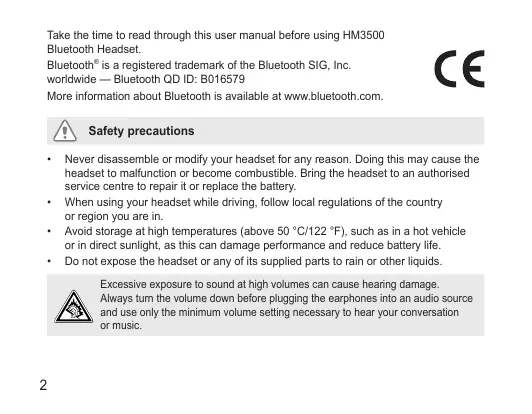 Take the time to read through this user manual before using HM3500 Bluetooth Headset. Bluetooth® is a registered trademark of the Bluetooth SIG, Inc. worldwide — Bluetooth QD ID: B016579 More information about Bluetooth is available at www.bluetooth.com. Safety precautions