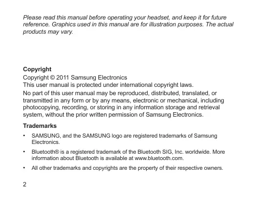 English Contents Please read this manual before operating your headset, and keep it for future reference. Graphics used in this manual are for illustration purposes. The actual products may vary. Copyright Copyright © 2011 Samsung Electronics This user manual is protected under international copyright laws. No part of this user manual may be reproduced, distributed, translated, or transmitted in any form or by any means, electronic or mechanical, including photocopying, recording, or storing in any information storage and retrieval system, without the prior written permission of Samsung Electronics. Trademarks