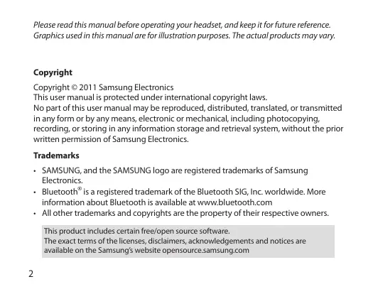 Please read this manual before operating your headset, and keep it for future reference. Graphics used in this manual are for illustration purposes. The actual products may vary. Copyright Copyright © 2011 Samsung Electronics This user manual is protected under international copyright laws. No part of this user manual may be reproduced, distributed, translated, or transmitted in any form or by any means, electronic or mechanical, including photocopying, recording, or storing in any information storage and retrieval system, without the prior written permission of Samsung Electronics. Trademarks