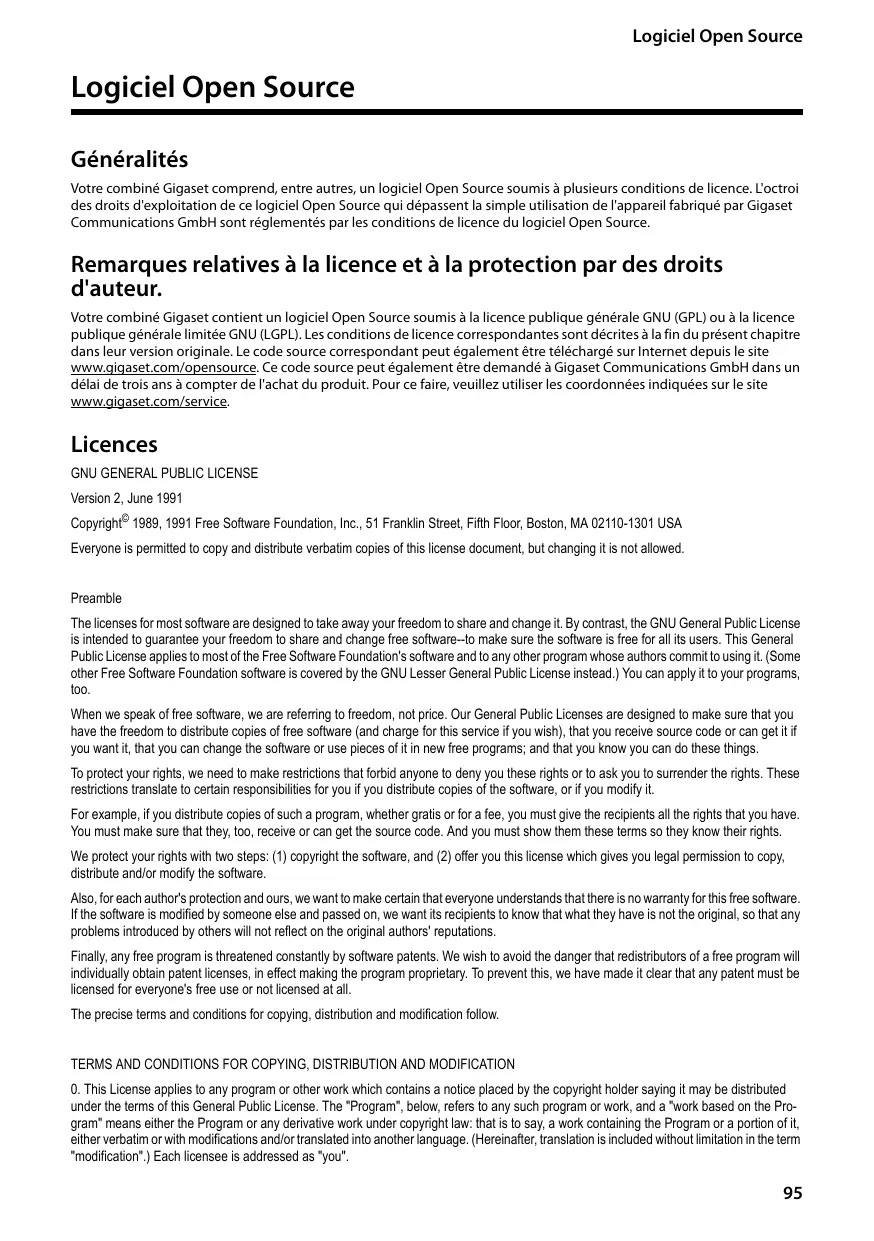 Remarques relatives à la licence et à la protection par des droits d'auteur. Votre combiné Gigaset contient un logiciel Open Source soumis à la licence publique générale GNU (GPL) ou à la licence publique générale limitée GNU (LGPL). Les conditions de licence correspondantes sont décrites à la fin du présent chapitre dans leur version originale. Le code source correspondant peut également être téléchargé sur Internet depuis le site www.gigaset.com/opensource. Ce code source peut également être demandé à Gigaset Communications GmbH dans un délai de trois ans à compter de l'achat du produit. Pour ce faire, veuillez utiliser les coordonnées indiquées sur le site www.gigaset.com/service.
