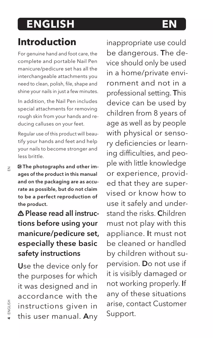 For genuine hand and foot care, the be dangerous. The decomplete and portable Nail Pen vice should only be used manicure/pedicure set has all the in a home/private enviinterchangeable attachments you need to clean, polish, file, shape and ronment and not in a shine your nails in just a few minutes. professional setting. This In addition, the Nail Pen includes device can be used by special attachments for removing children from 8 years of rough skin from your hands and reducing calluses on your feet. age as well as by people EN