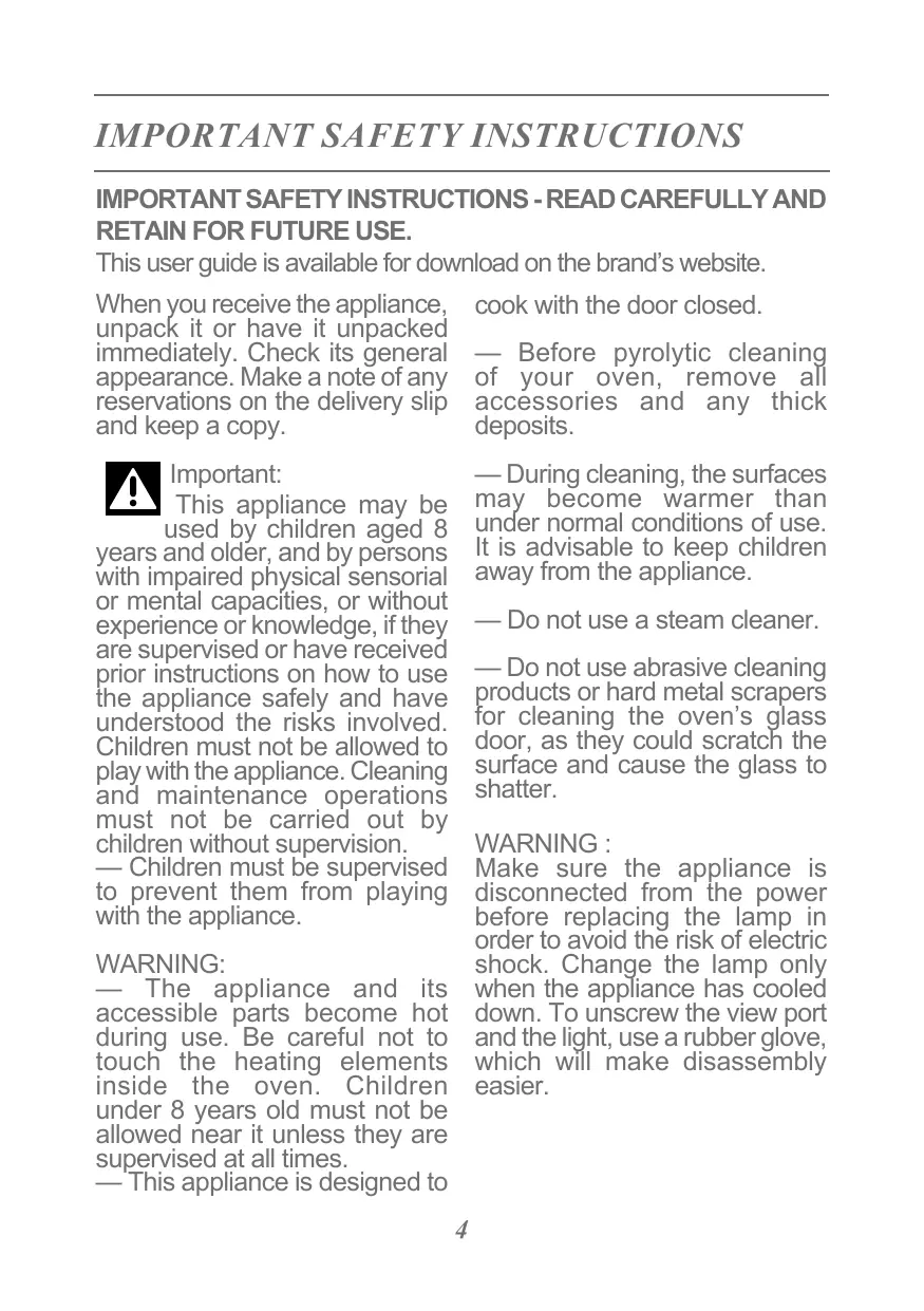 IMPORTANT SAFETY INSTRUCTIONS IMPORTANT SAFETY INSTRUCTIONS - READ CAREFULLY AND RETAIN FOR FUTURE USE. This user guide is available for download on the brand’s website. When you receive the appliance, unpack it or have it unpacked immediately. Check its general appearance. Make a note of any reservations on the delivery slip and keep a copy.