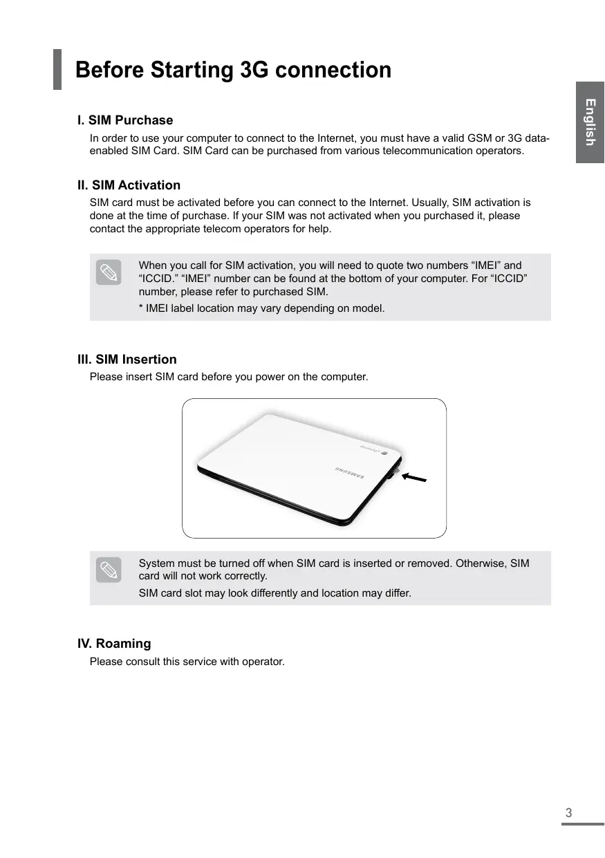 SIM card must be activated before you can connect to the Internet. Usually, SIM activation is done at the time of purchase. If your SIM was not activated when you purchased it, please contact the appropriate telecom operators for help. When you call for SIM activation, you will need to quote two numbers “IMEI” and “ICCID.” “IMEI” number can be found at the bottom of your computer. For “ICCID” number, please refer to purchased SIM.