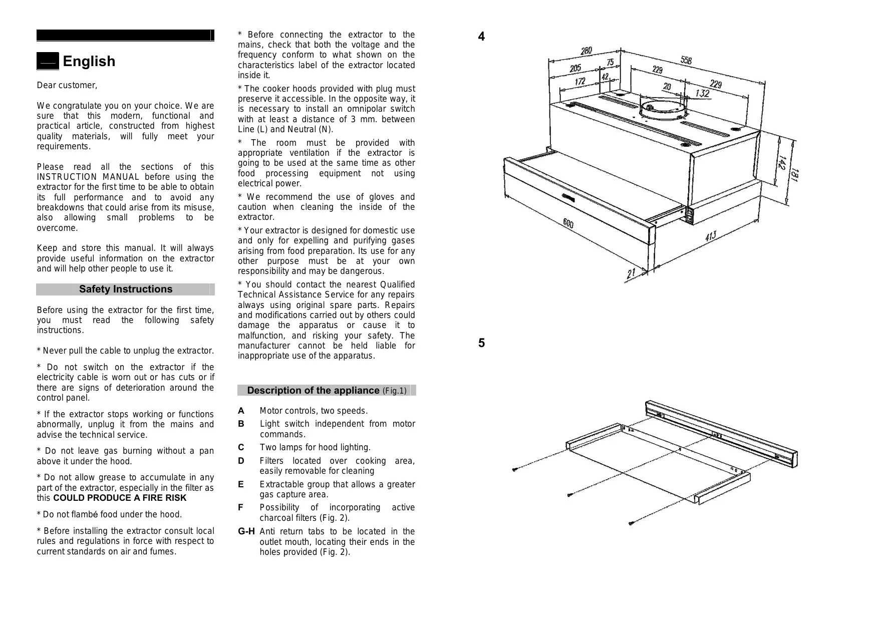 E Ensemble extractible permettant une plus grande surface de captation des gaz. F Possibilité d’incorporer des filtres à charbon actif (Fig. 2). G-H Ailettes anti-retour qui seront mises en place à la bouche de sortie avec leurs extrémités placées sur les orifices disposés à cet effet (Fig. 2).
