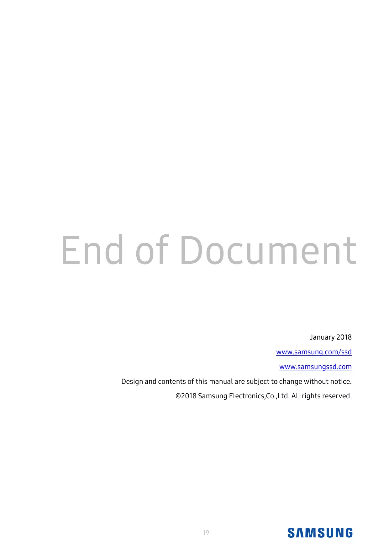 January 2018 www.samsung.com/ssd www.samsungssd.com Design and contents of this manual are subject to change without notice. © 2018 Samsung Electronics,Co.,Ltd. All rights reserved.