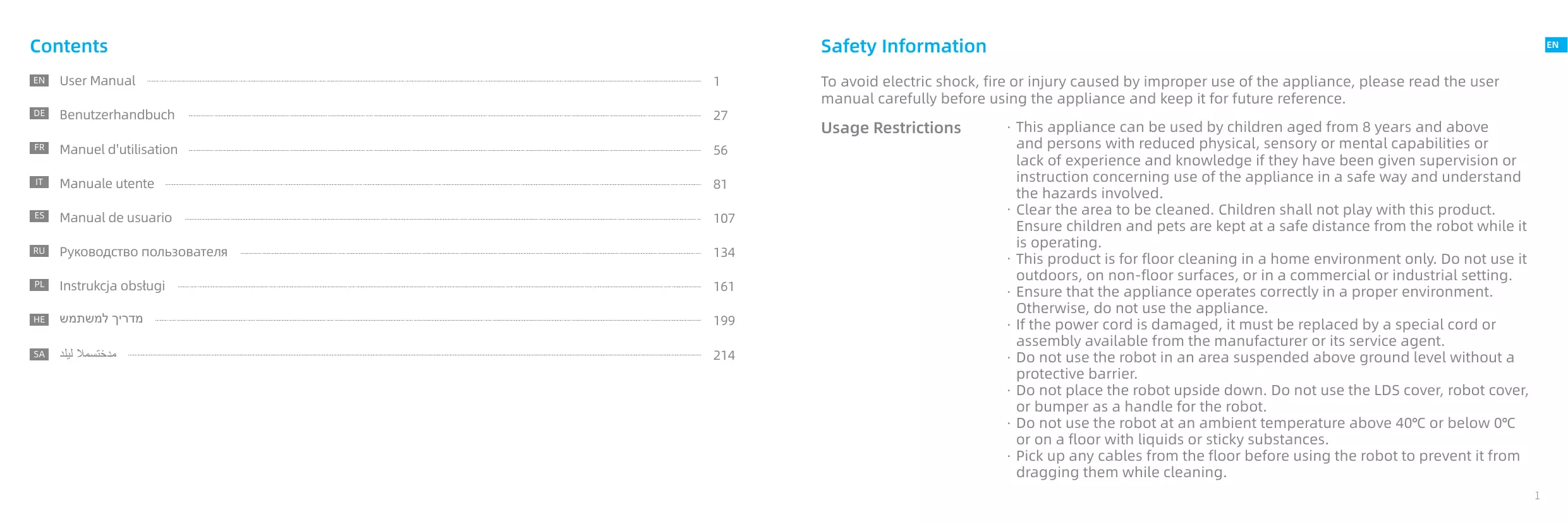 · Retirez tous les câbles au sol avant d’utiliser le robot pour éviter qu’il ne les entraine dedans pendant le nettoyage. · Retirez tous les objets fragiles ou de petite taille au sol afin d’éviter que le robot ne les percute ou ne les endommage. · Maintenez vos cheveux, vos doigts et les autres parties de votre corps éloignés de l’orifice d’aspiration du robot. · Gardez l'outil de nettoyage hors de portée des enfants. · Ne faites pas fonctionner l'appareil dans une pièce où un nourrisson ou un enfant dort. · Ne mettez pas d’enfants, d’animaux ou d’objets sur le robot, qu’il soit à l’arrêt ou en mouvement. · N’utilisez pas le robot pour nettoyer des objets brûlants. N'utilisez pas le robot pour ramasser des liquides inflammables ou combustibles, des gaz corrosifs ou des acides ou solvants non dilués. · N’aspirez pas d’objets durs ou tranchants. N'utilisez pas l'appareil pour ramasser des objets tels que des pierres, de gros morceaux de papier ou tout autre élément susceptible d'obstruer l'appareil. · Veuillez éteindre et débrancher l'appareil avant de le nettoyer et de l'entretenir. · N'utilisez pas de chiffon humide pour essuyer ou de liquide pour rincer le robot et la base. Les pièces lavables doivent être complètement séchées avant d'être installées et utilisées. · Veuillez utiliser ce produit conformément aux instructions du Mode d’emploi. Les utilisateurs sont responsables des pertes ou dommages résultant d’une mauvaise utilisation de ce produit.