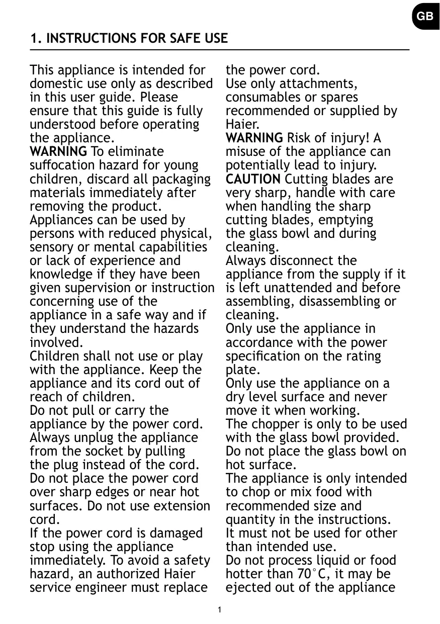 N’utilisez que les accessoires, les consommables et les pièces de rechange recommandés ou fournis par Haier. AVERTISSEMENT Risque de blessures ! Une mauvaise utilisation de l’appareil peut potentiellement entraîner des blessures. PRÉCAUTIONS Les lames de coupe sont très tranchantes ; faites attention lors de la manipulation des lames de coupe tranchantes, la vidange du bol en verre et le nettoyage. Débranchez toujours l’appareil s’il est laissé sans surveillance et avant de le monter, de le démonter ou de le nettoyer. N’utilisez l’appareil qu’en fonction de la puissance indiquée sur la fiche signalétique. N’utilisez l’appareil que sur une surface plane et sèche et ne le déplacez jamais lorsque vous travaillez. Le hacheur ne doit être utilisé qu’avec le bol en verre fourni. Ne placez pas le bol en verre sur une surface chaude. L’appareil est uniquement destiné à hacher ou à mélanger des aliments dont la taille et la quantité sont recommandées dans les consignes. Il ne doit pas être utilisé à d’autres fins que celles prévues. Ne traitez pas de liquide ou de nourriture plus chauds que 70°C 5