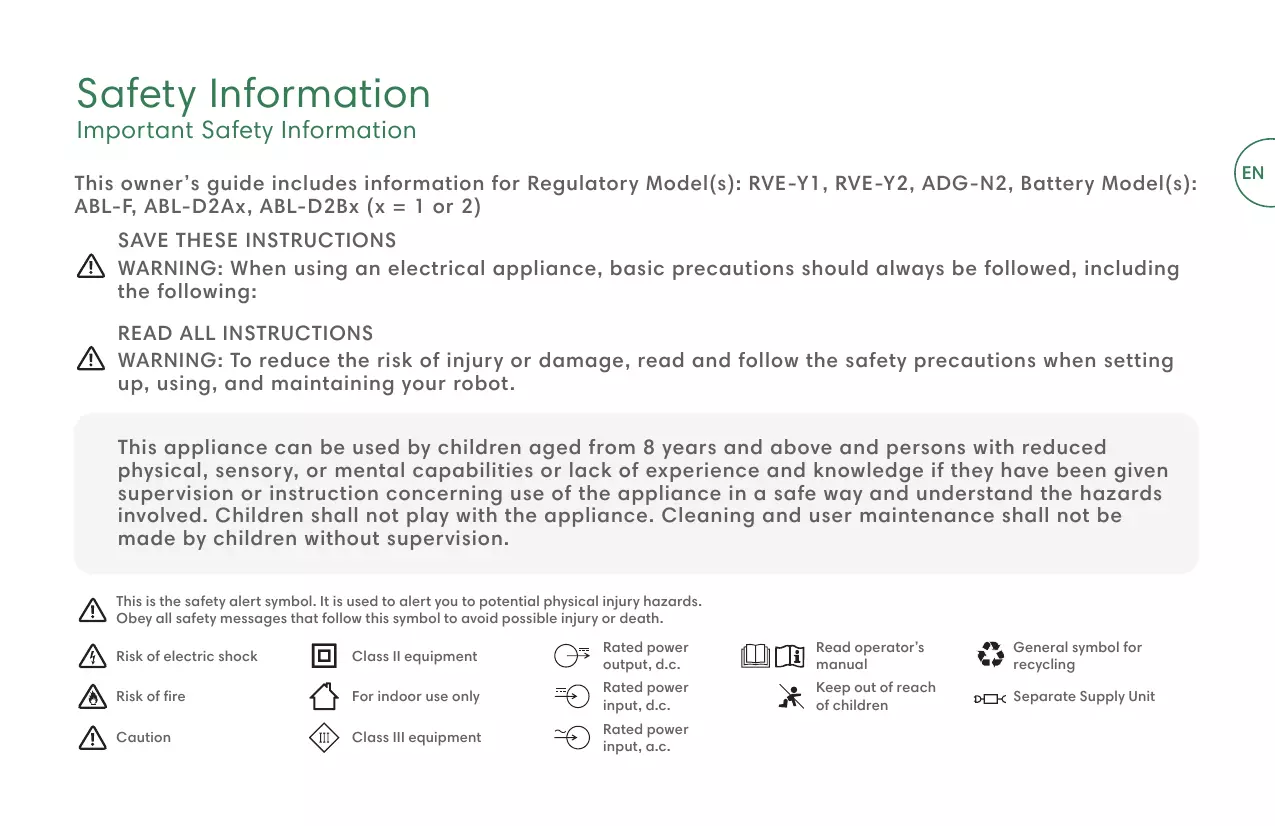 FR Ce guide du propriétaire comprend des renseignements sur les modèles de réglementation : RVE-Y1, RVE-Y2, ADG-N2, Batterie : ABL-F, ABL-D2Ax, ABL-D2Bx (x = 1 or 2) CONSERVER CES INSTRUCTIONS AVERTISSEMENT : lorsque vous utilisez un appareil électrique, vous devez respecter certaines précautions de base, notamment : LISEZ TOUTES LES INSTRUCTIONS AVERTISSEMENT: pour éviter tout risque de blessure ou de dommage, lisez et respectez les consignes de sécurité suivantes lors de la configuration, de l’utilisation et de l’entretien de votre robot. Cet appareil peut être utilisé par des enfants âgés de 8 ans et plus, et par des personnes ayant des capacités physiques, sensorielles ou mentales réduites, ou un manque d’expérience et de connaissances, si des conseils ou instructions leur ont été donnés concernant l’utilisation en toute sécurité de l’appareil et les dangers impliqués. Les enfants ne doivent pas jouer avec l’appareil. Le nettoyage et l’entretien par l’utilisateur ne doivent pas être effectués par des enfants sans surveillance. Voici le symbole d’alerte de sécurité. Il est utilisé pour vous informer d’éventuels risques de blessure. Respectez tous les messages de sécurité qui suivent ce symbole afin d’éviter tout risque de blessure ou de mort. Risque d’électrocution