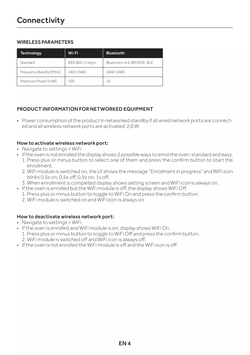 PRODUCT INFORMATION FOR NETWORKED EQUIPMENT • Power consumption of the product in networked standby if all wired network ports are connected and all wireless network ports are activated: 2,0 W How to activate wireless network port: • Navigate to settings > WiFi • If the oven is not enrolled the display shows 2 possible ways to enrol the oven: standard and easy. 1. Press plus or minus button to select one of them and press the confirm button to start the enrollment. 2. WiFi module is switched on, the UI shows the message “Enrollment in progress” and WiFi icon blinks 0,5s on, 0,5s off, 0,5s on, 1s off. 3. When enrollment is completed display shows setting screen and WiFi icon is always on. • If the oven is enrolled but the WiFi module is off, the display shows WiFi Off. 1. Press plus or minus button to toggle to WiFi On and press the confirm button. 2. WiFi module is switched on and WiFi icon is always on How to deactivate wireless network port: • Navigate to settings > WiFi • If the oven is enrolled and WiFi module is on, display shows WiFi On. 1. Press plus or minus button to toggle to WiFi Off and press the confirm button. 2. WiFi module is switched off and WiFi icon is always off. • If the oven is not enrolled the WiFi module is off and the WiFi icon is off.