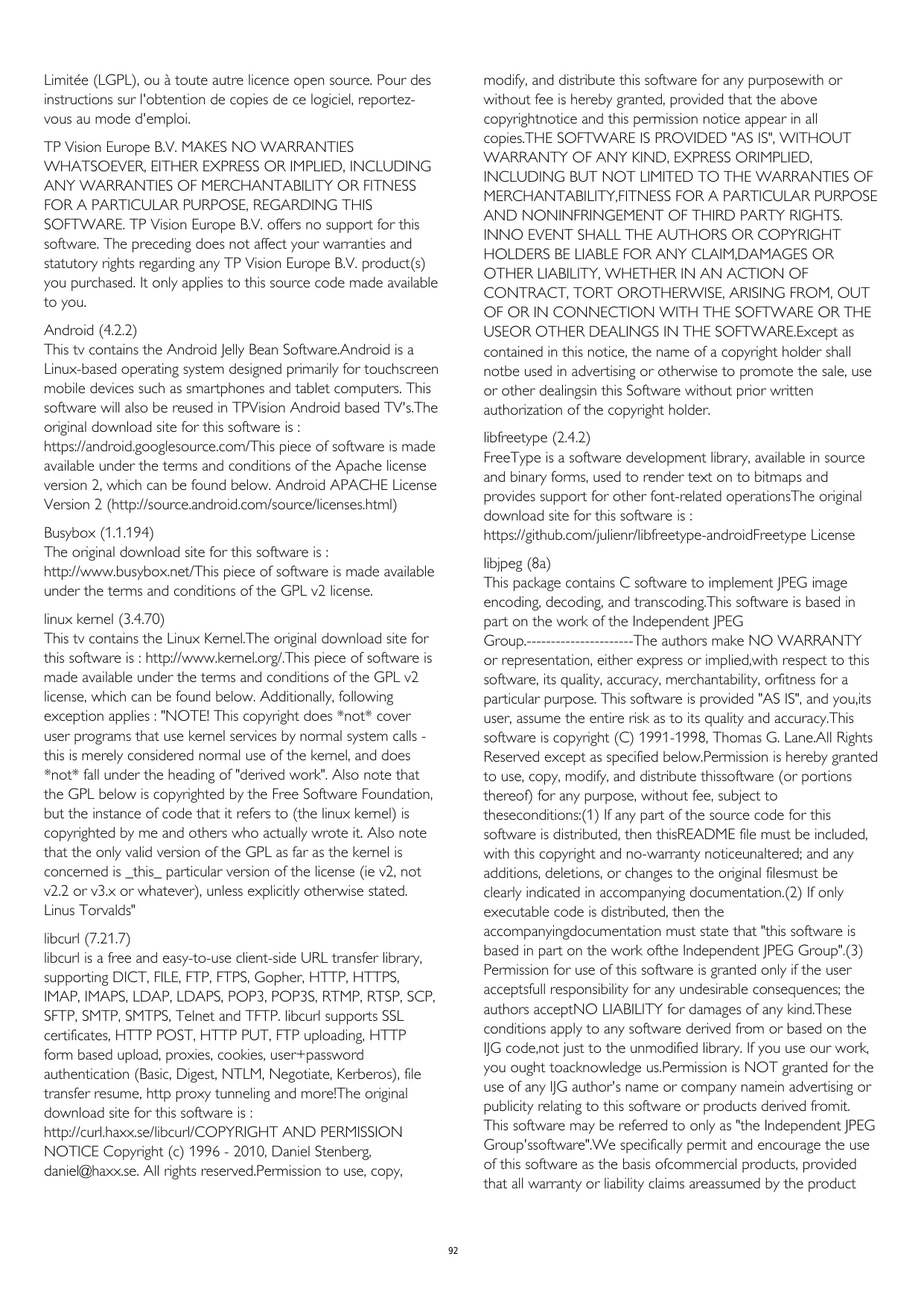 SOFTWARE. TP Vision Europe B.V. offers no support for this software. The preceding does not affect your warranties and statutory rights regarding any TP Vision Europe B.V. product(s) you purchased. It only applies to this source code made available to you. Android (4.2.2) This tv contains the Android Jelly Bean Software.Android is a Linux-based operating system designed primarily for touchscreen mobile devices such as smartphones and tablet computers. This software will also be reused in TPVision Android based TV's.The original download site for this software is : https://android.googlesource.com/This piece of software is made available under the terms and conditions of the Apache license version 2, which can be found below. Android APACHE License Version 2 (http://source.android.com/source/licenses.html) libfreetype (2.4.2) FreeType is a software development library, available in source and binary forms, used to render text on to bitmaps and provides support for other font-related operationsThe original download site for this software is : https://github.com/julienr/libfreetype-androidFreetype License Busybox (1.1.194) The original download site for this software is : http://www.busybox.net/This piece of software is made available under the terms and conditions of the GPL v2 license. libjpeg (8a) This package contains C software to implement JPEG image encoding, decoding, and transcoding.This software is based in part on the work of the Independent JPEG Group.----------------------The authors make NO WARRANTY or representation, either express or implied,with respect to this software, its quality, accuracy, merchantability, orfitness for a particular purpose. This software is provided "AS IS", and you,its user, assume the entire risk as to its quality and accuracy.This software is copyright (C) 1991-1998, Thomas G. Lane.All Rights Reserved except as specified below.Permission is hereby granted to use, copy, modify, and distribute thissoftware (or portions thereof) for any purpose, without fee, subject to theseconditions:(1) If any part of the source code for this software is distributed, then thisREADME file must be included, with this copyright and no-warranty noticeunaltered; and any additions, deletions, or changes to the original filesmust be clearly indicated in accompanying documentation.(2) If only executable code is distributed, then the accompanyingdocumentation must state that "this software is based in part on the work ofthe Independent JPEG Group".(3) Permission for use of this software is granted only if the user acceptsfull responsibility for any undesirable consequences; the authors acceptNO LIABILITY for damages of any kind.These conditions apply to any software derived from or based on the IJG code,not just to the unmodified library. If you use our work, you ought toacknowledge us.Permission is NOT granted for the use of any IJG author's name or company namein advertising or publicity relating to this software or products derived fromit. This software may be referred to only as "the Independent JPEG Group'ssoftware".We specifically permit and encourage the use of this software as the basis ofcommercial products, provided that all warranty or liability claims areassumed by the product linux kernel (3.4.70) This tv contains the Linux Kernel.The original download site for this software is : http://www.kernel.org/.This piece of software is made available under the terms and conditions of the GPL v2 license, which can be found below. Additionally, following exception applies : "NOTE! This copyright does *not* cover user programs that use kernel services by normal system calls this is merely considered normal use of the kernel, and does *not* fall under the heading of "derived work". Also note that the GPL below is copyrighted by the Free Software Foundation, but the instance of code that it refers to (the linux kernel) is copyrighted by me and others who actually wrote it. Also note that the only valid version of the GPL as far as the kernel is concerned is _this_ particular version of the license (ie v2, not v2.2 or v3.x or whatever), unless explicitly otherwise stated. Linus Torvalds" libcurl (7.21.7) libcurl is a free and easy-to-use client-side URL transfer library, supporting DICT, FILE, FTP, FTPS, Gopher, HTTP, HTTPS, IMAP, IMAPS, LDAP, LDAPS, POP3, POP3S, RTMP, RTSP, SCP, SFTP, SMTP, SMTPS, Telnet and TFTP. libcurl supports SSL certificates, HTTP POST, HTTP PUT, FTP uploading, HTTP form based upload, proxies, cookies, user+password authentication (Basic, Digest, NTLM, Negotiate, Kerberos), file transfer resume, http proxy tunneling and more!The original download site for this software is : http://curl.haxx.se/libcurl/COPYRIGHT AND PERMISSION NOTICE Copyright (c) 1996 - 2010, Daniel Stenberg, daniel@haxx.se. All rights reserved.Permission to use, copy,