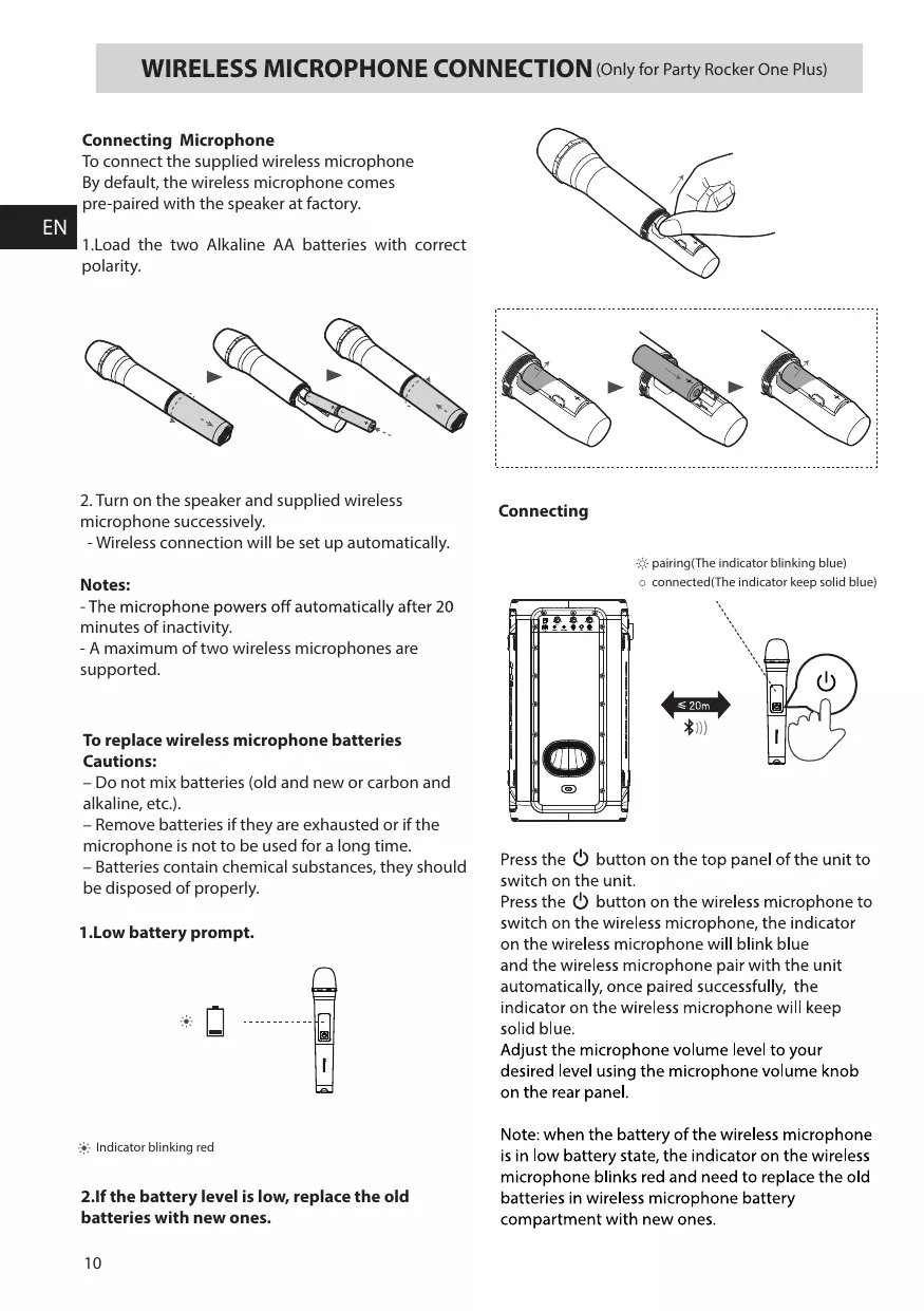 Pour connecter le microphone sans fil fourni par défaut, le microphone sans fil a été préalablement FR associé en usine au haut-parleur. 1. Insérez les deux piles alcalines AA en respectant la polarité.